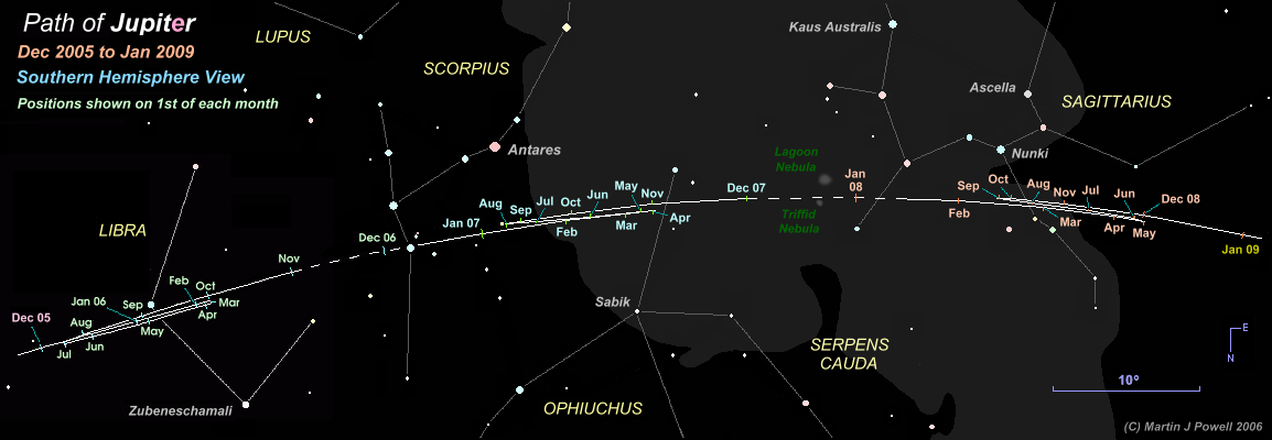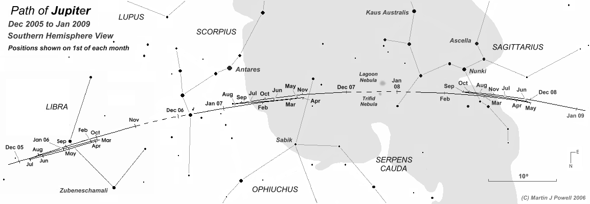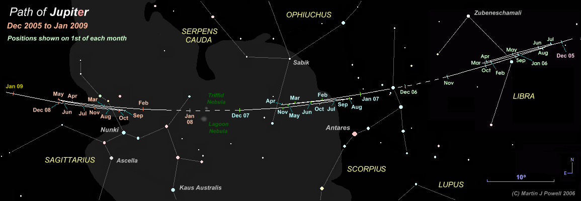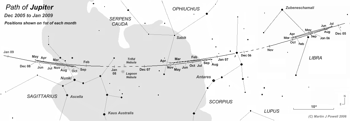 The path of Jupiter against the background stars of Libra, Scorpius, Ophiuchus and Sagittarius from December 2005 to January 2009, with positions marked at the start of each month (click on the thumbnail for the full-size image, 79 KB). Periods when the planet was unobservable (i.e. when it was too close to the Sun, or passed behind it) are indicated by a dashed line. Hence the planet became lost from view (in the evening sky) in early November 2006 and became visible again (in the morning sky) in early December 2006.