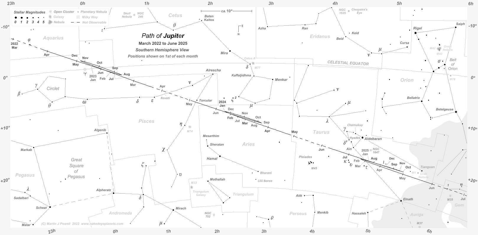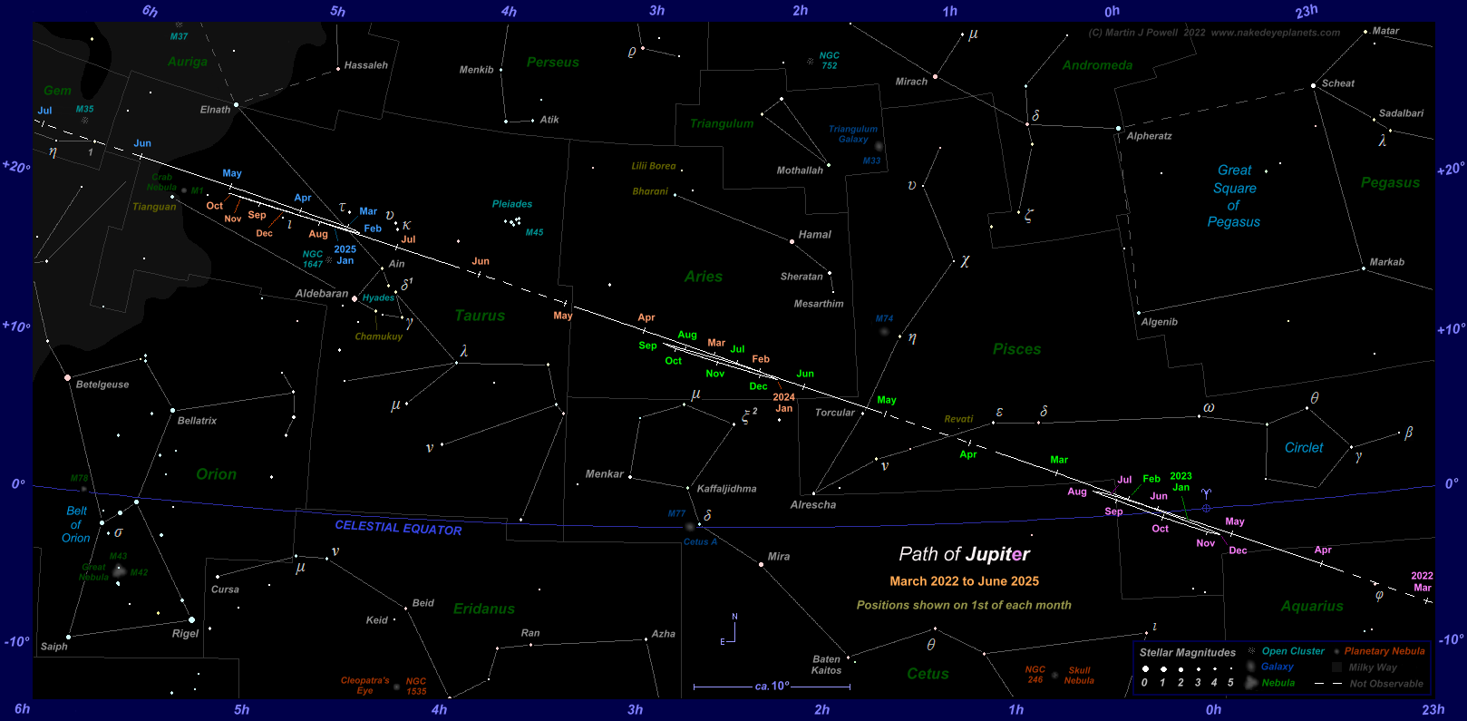 The path of Jupiter against the background stars of Pisces, Aries and Taurus from March 2022 to June 2025, with positions marked on the 1st of each month (click on the thumbnail for the full-size image). Periods when the planet was unobservable (i.e. when it was too close to the Sun, or passed behind it) are indicated by a dashed line; hence the planet became lost from view (in the evening sky) in late March 2023 and became visible again (in the morning sky) in early May of that year. The chart shows the changing shape of a planet's apparent looping formation as it moves through the zodiac: Jupiter described Southward-facing loops in both the 2022-23 and 2023-24 observing periods, morphing to a 'hybrid' loop (half loop, half zig-zag) in the 2024-25 period as the planet approached its ecliptic crossing in late 2025.
