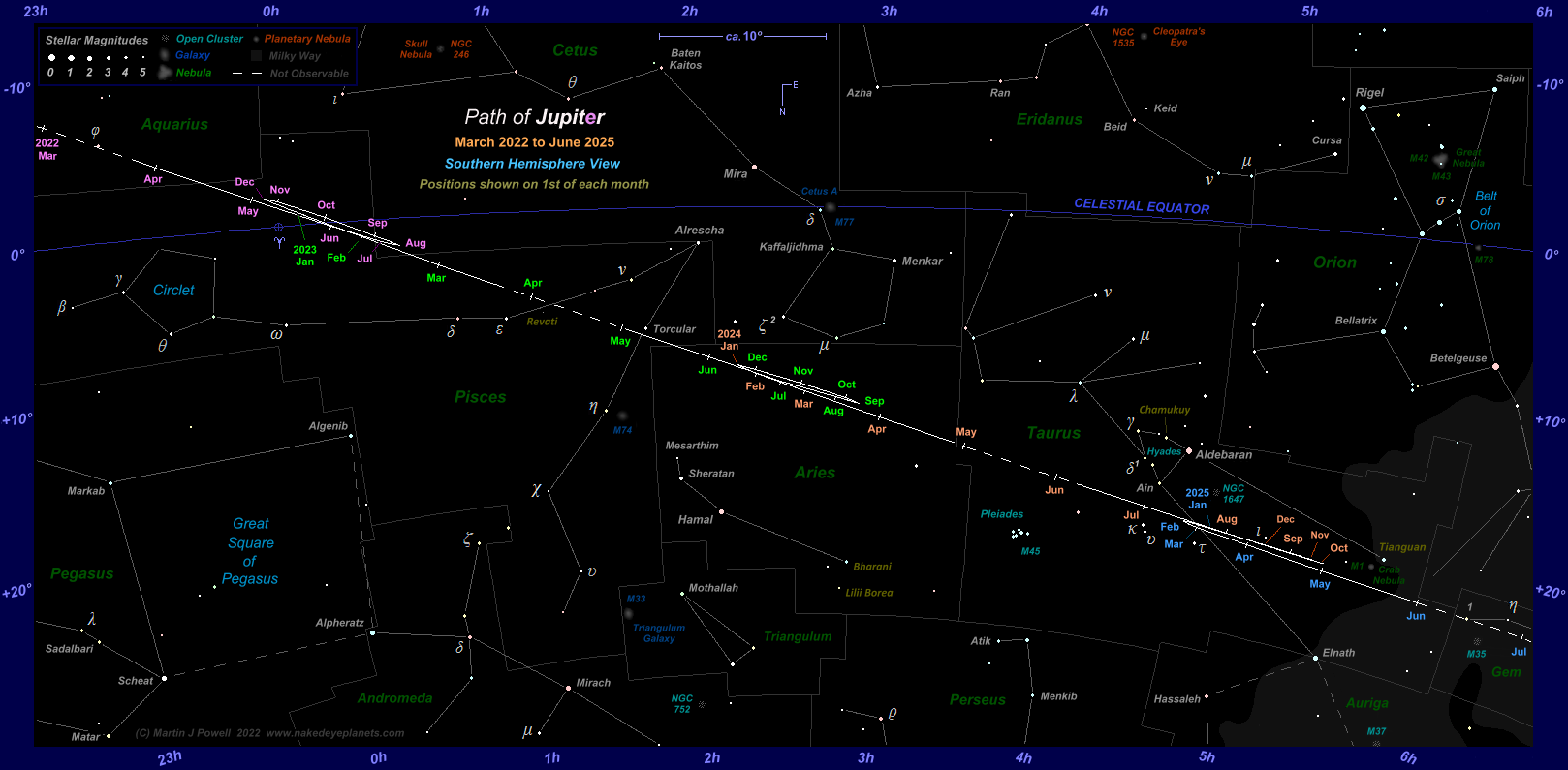Pisces, Aries and Taurus Three photographs showing the region of the night sky through which Jupiter passed from mid-2022 to mid-2025 (click on the thumbnails for their full-size versions). The regions of the star chart which are covered by each photograph are shown on the overlay chart above; dashed lines indicate that the photograph extends beyond the boundaries of the chart. In the Pisces photo the limiting magnitude is about +6.5 whilst in the Aries & Western Taurus photo it is about +7.5. For the Taurus photo, the limiting magnitude is about +8.0. Note that the photographs do not have the same scale because of the varying camera lens settings and image resolutions.