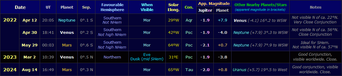 Jupiter conjunctions with other planets from April 2022 to August 2024 (click on thumbnail for full-size table). The column headed 'UT' is the Universal Time (equivalent to GMT) of the conjunction (in hrs : mins). The separation (column 'Sep') is the angular distance between the two planets, measured relative to Jupiter, e.g. on 2023 Mar 2, Venus was positioned 0°.5 North of Jupiter at the time shown. The 'Favourable Hemisphere' column shows the Hemisphere in which the conjunction was best observed. The expression 'Not high NHem' indicates that observers at latitudes further North than about 45°N will have found the conjunction difficult or impossible to observe because of low altitude and/or bright twilight.