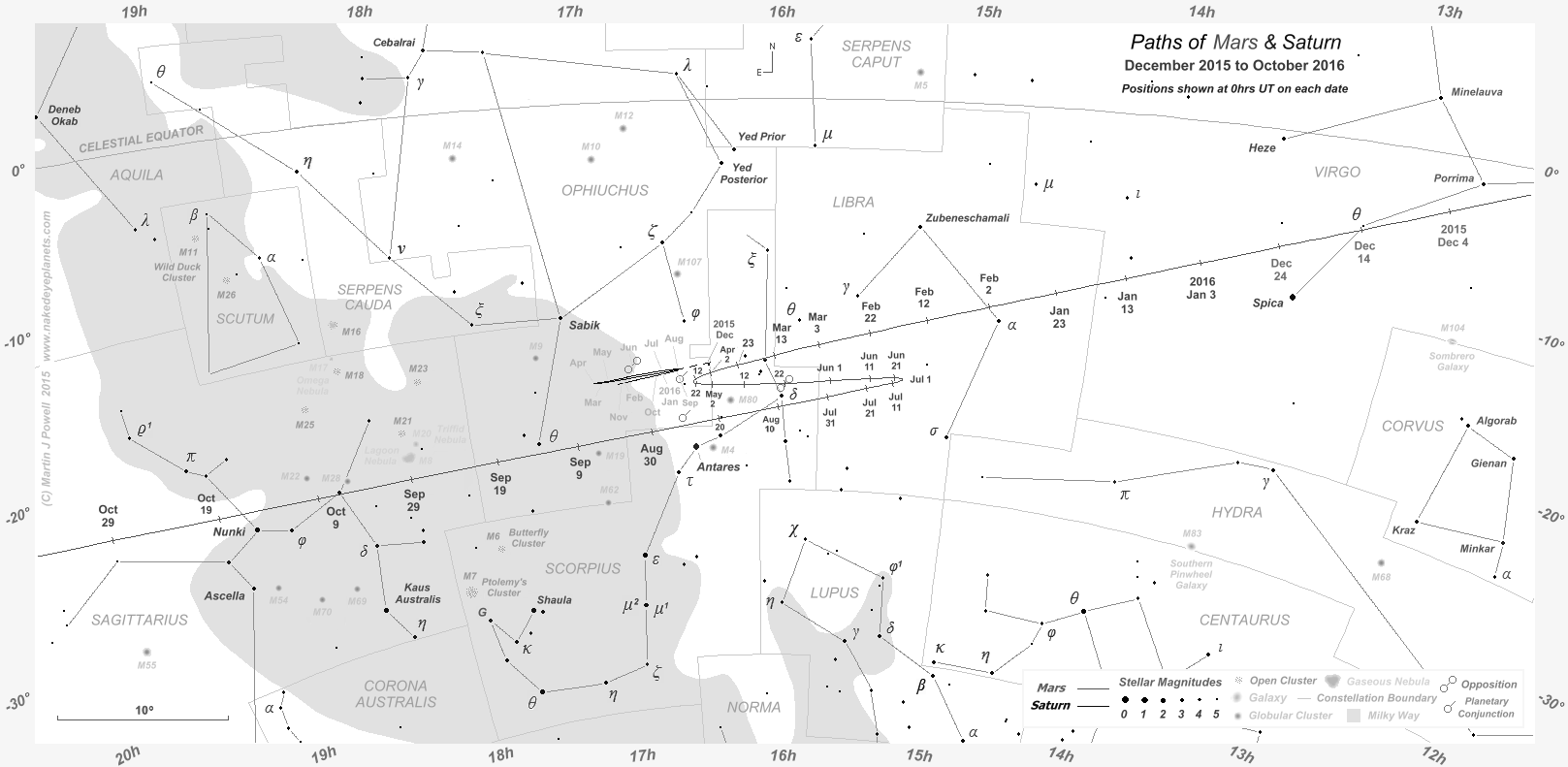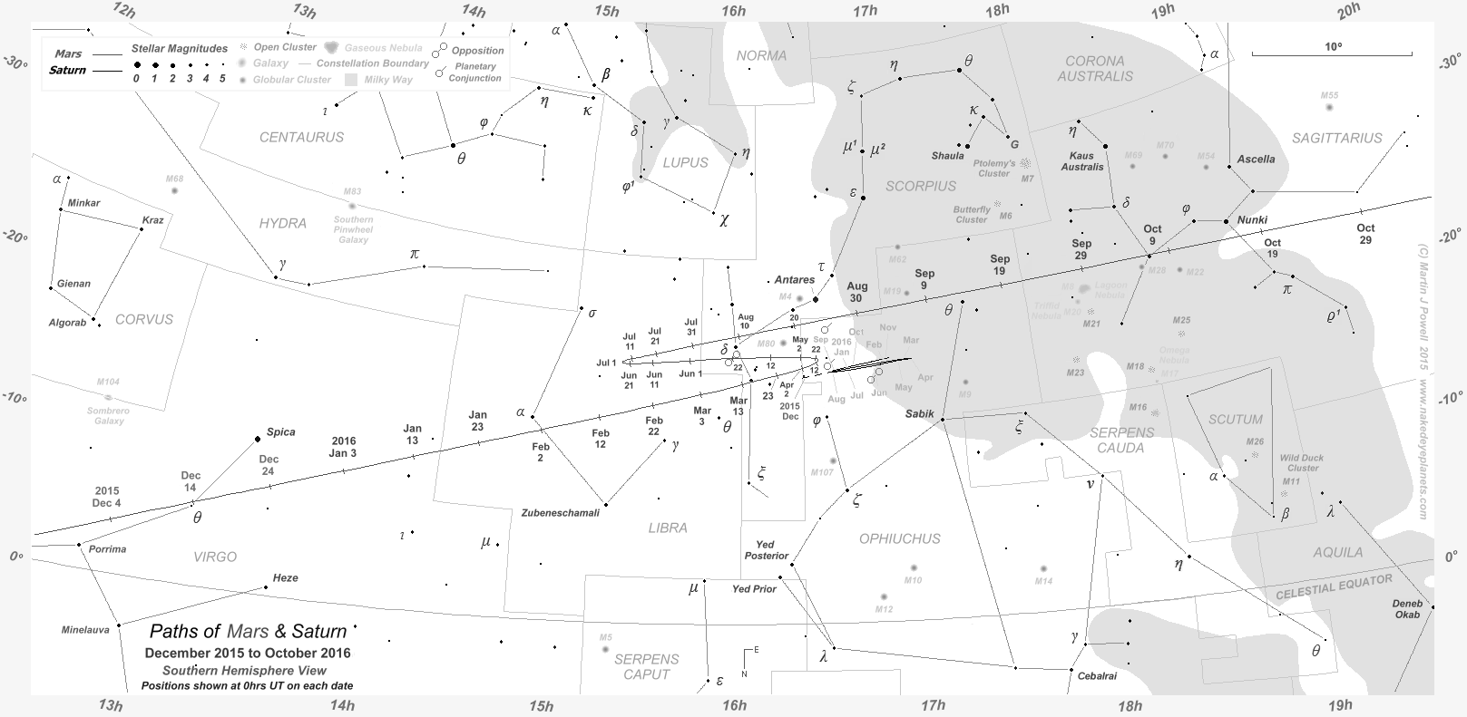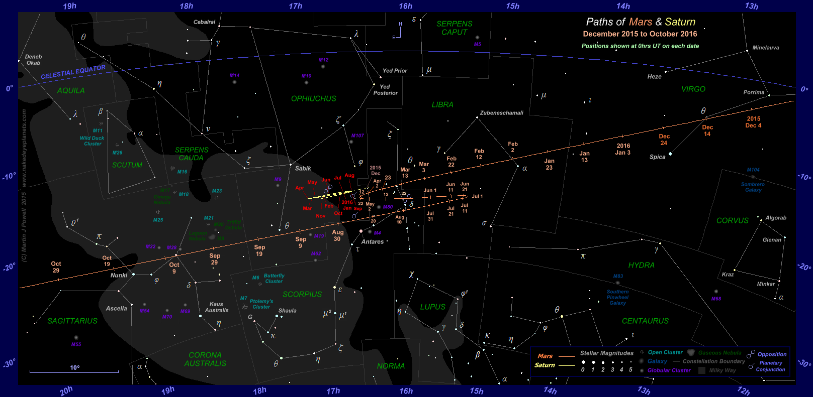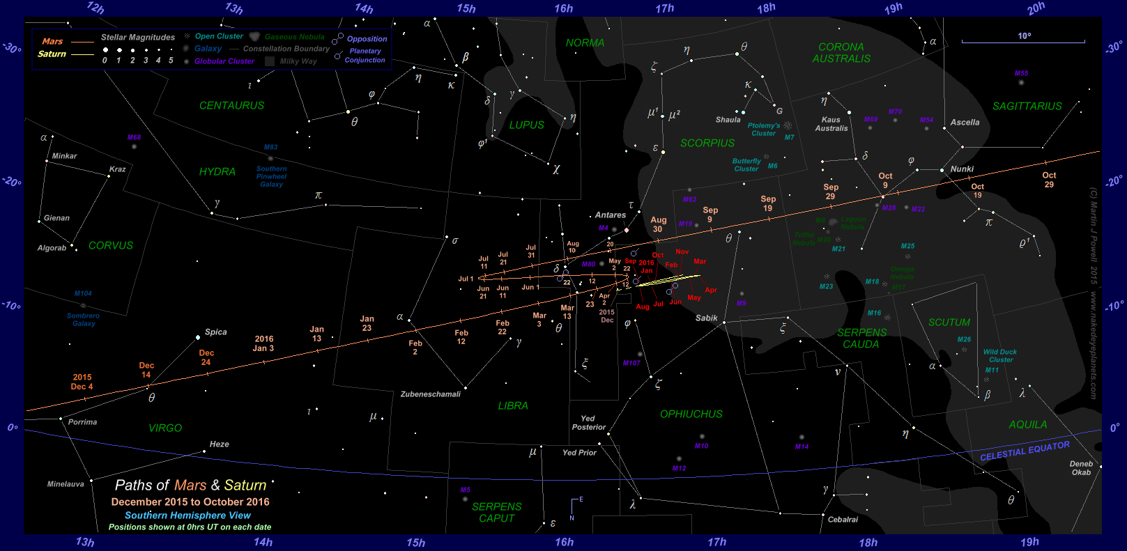 The path of Mars against the background stars of the Southern zodiac from December 2015 to October 2016, shown at 10-day intervals (click on the thumbnail for a full-size image, 203 KB). During this apparition Mars described a Southward zig-zag formation against the background stars, unlike the 'hybrid' loop that it described during the planet's previous apparition in 2013-15. The path of Saturn in Southern Ophiuchus is also marked at the beginning of each month over the same period; the two planets passed each other in the evening sky in late August 2016 (for more details see the planetary conjunctions section below). The star map applies to observers in the Northern hemisphere (i.e. North is up); for the Southern hemisphere view, click here (208 KB).