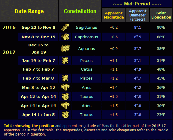 Table showing the position and apparent magnitude of Mars for the latter part of the 2015-17 apparition (click on thumbnail for full-size table, 32 KB). As in the first table, the magnitudes, diameters and solar elongations refer to the middle of the period in question.