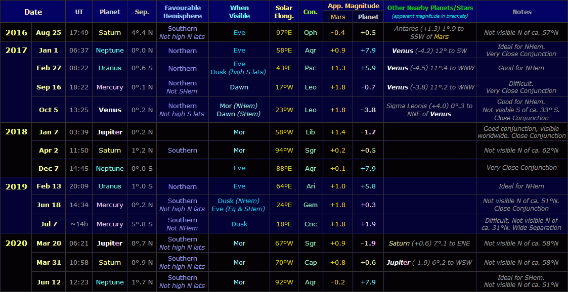 A table of planetary conjunctions involving Mars from 2016 to 2020 can be seen here (67 KB).