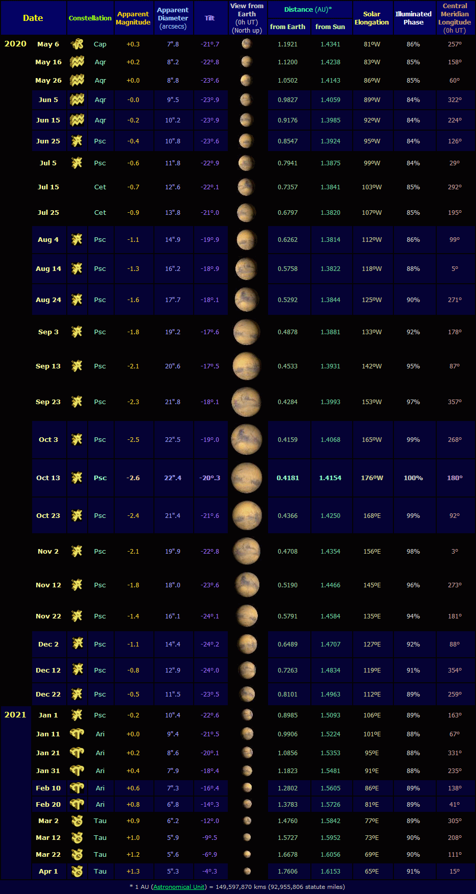 Mars conjunctions with other planets from March 2020 to August 2021 (click on thumbnail for full-size table, 34 KB). The column headed 'UT' is the Universal Time (equivalent to GMT) of the conjunction (in hrs : mins). The separation (column 'Sep') is the angular distance between the two planets, measured relative to Mars, e.g. on 2020 Mar 31, Saturn was positioned 0°.9 North of Mars at the time shown. The 'Favourable Hemisphere' column shows the Hemisphere in which the conjunction was best observed. The expression 'Not high N/S Lats' indicates that observers at latitudes further North than about 45°N (or further South than about 45°S) will have found the conjunction difficult or impossible to view because of low altitude and/or bright twilight.