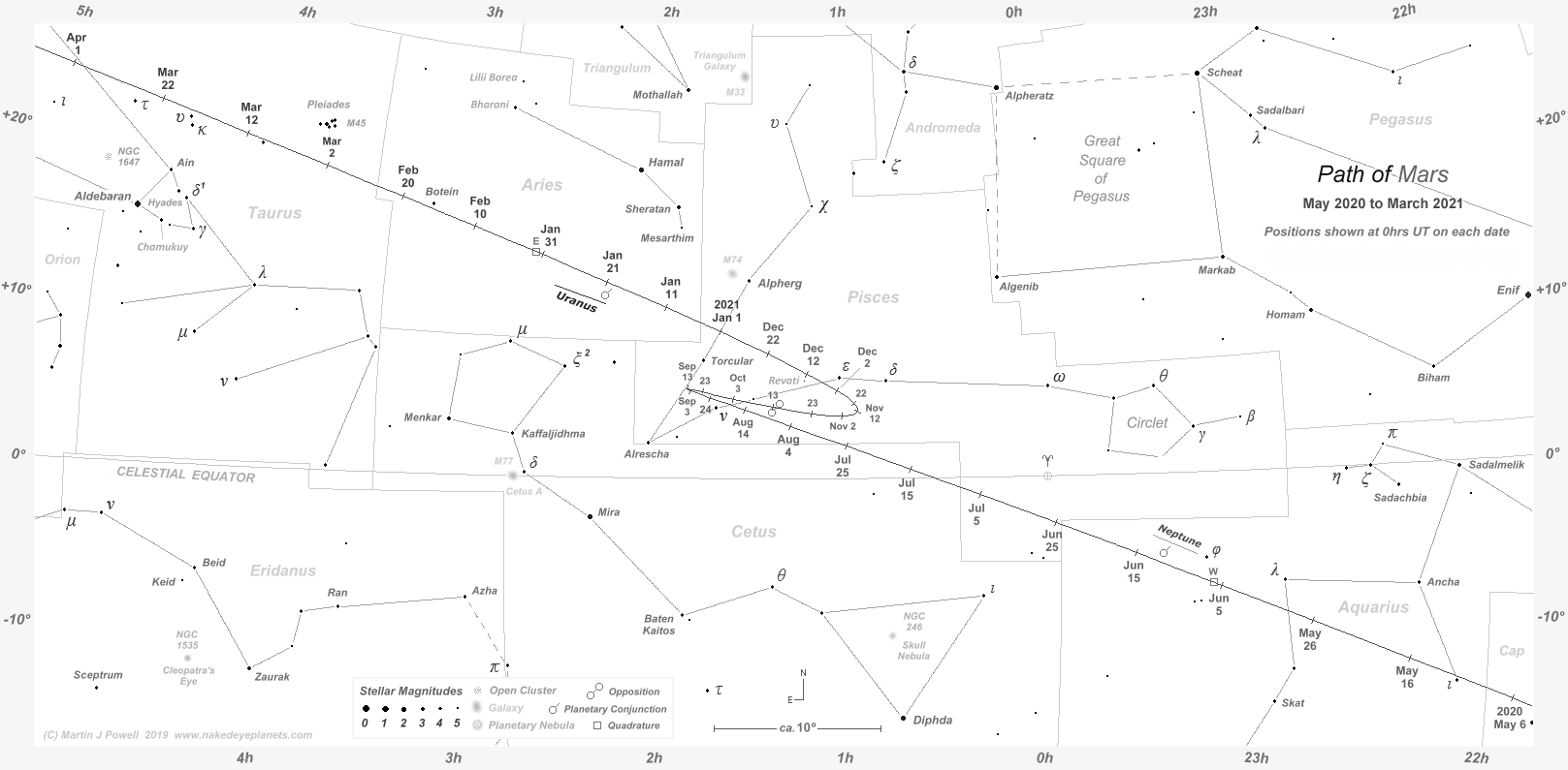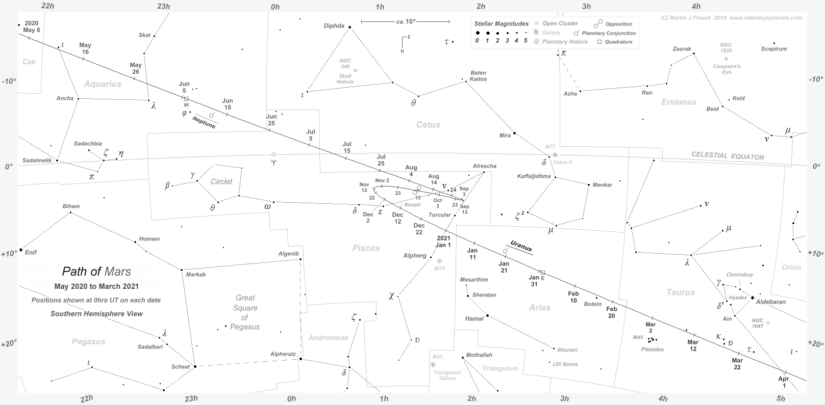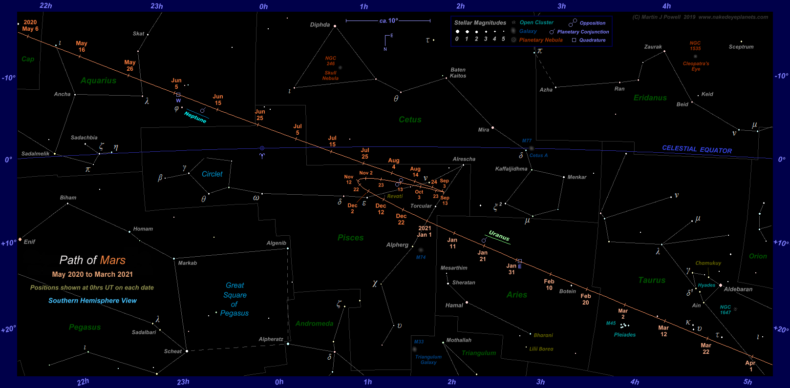 delayed the appearance of Mars until early November (35° South)