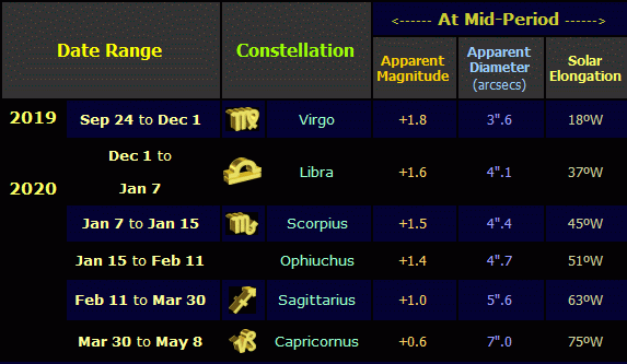At superior conjunction on September 2nd 2019 (when it passed directly behind the Sun in the constellation of Leo, the Lion), Mars was positioned 2.6747 Astronomical Units (AU) from Earth (400.1 million kms or 248.6 million miles). Were it to have been visible from Earth at this time, its apparent magnitude would have been +1.7 and its apparent size only 3".5 (i.e. 3.5 arcseconds, where 1" = 1/60th of an arcminute or 1/3600 of a degree). Mars entered the constellation of Virgo, the Virgin, on September 24th, becoming visible in the dawn twilight from Northern Tropical latitudes in early October. The planet moved to the South of the celestial equator (where the declination of a celestial body is 0°) on October 7th, becoming visible from Equatorial and mid-Northern latitudes over the coming days.