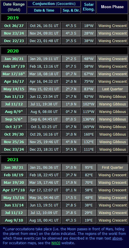 The Moon is easy to find, and on one or two days in each month, it passes Mars in the sky. The following tables list the dates on which the Moon passed near the planet during its 2019-21 apparition: