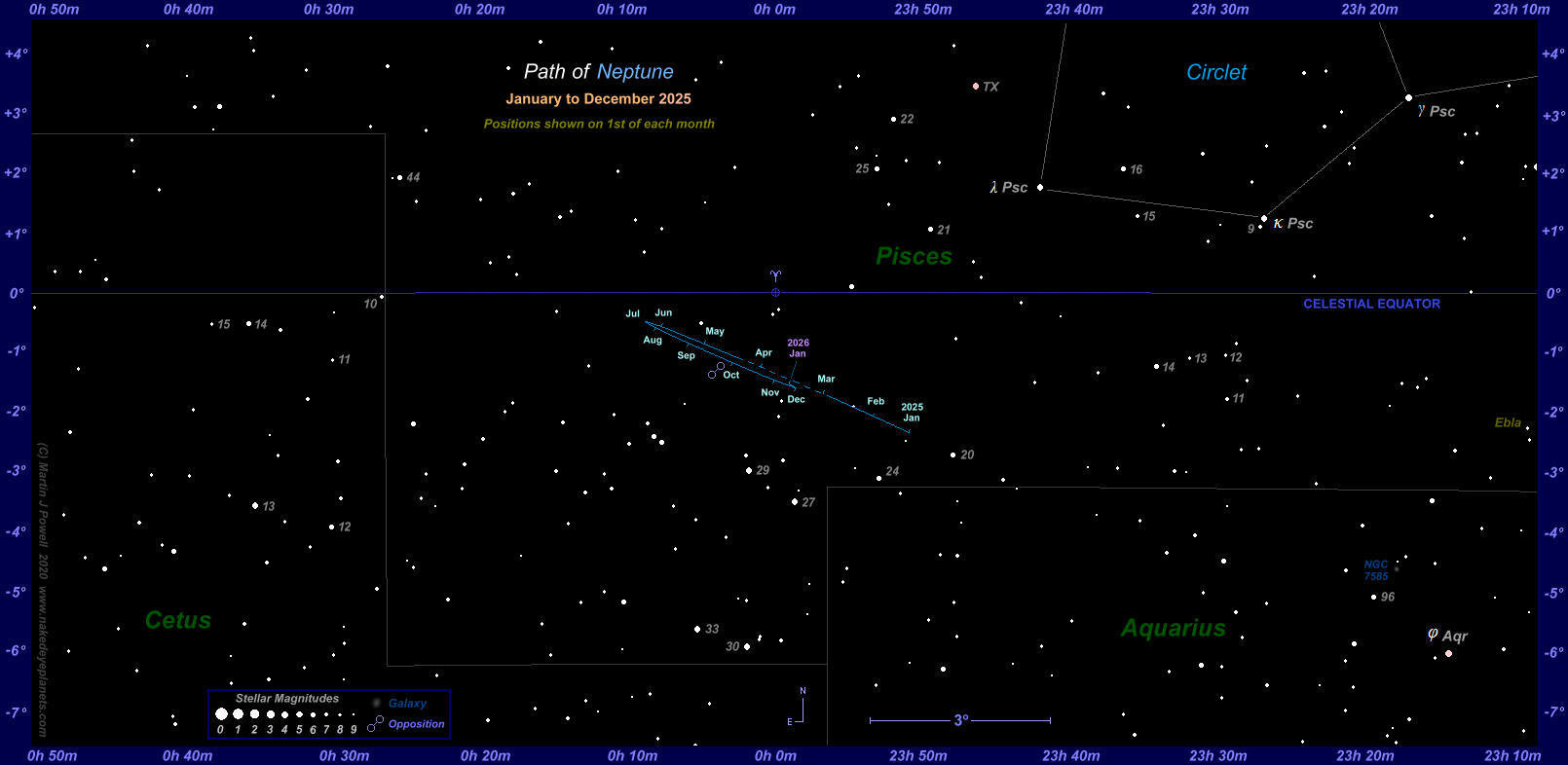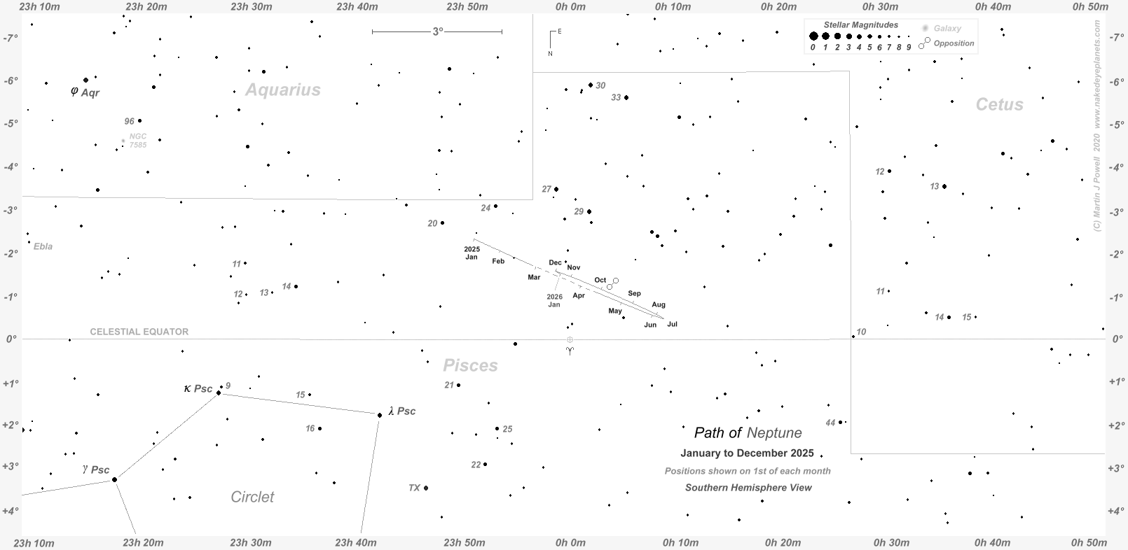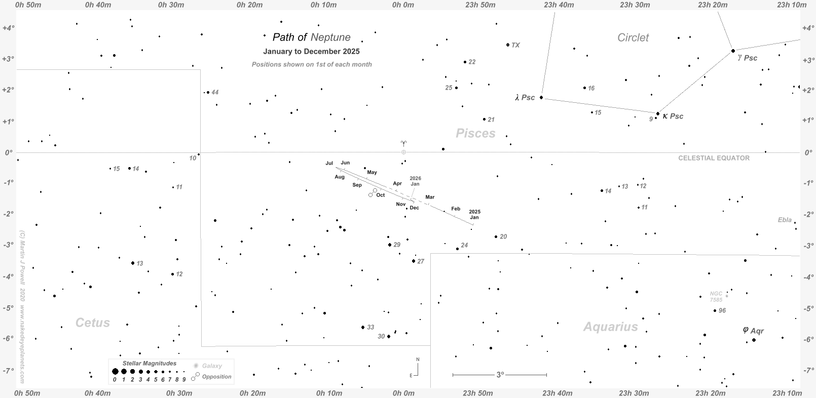 During 2025 Neptune can be found in South-western Pisces, close to its border with Aquarius, the Water Carrier. It reaches opposition in September, positioned several degrees South-east of the Circlet of Pisces asterism.