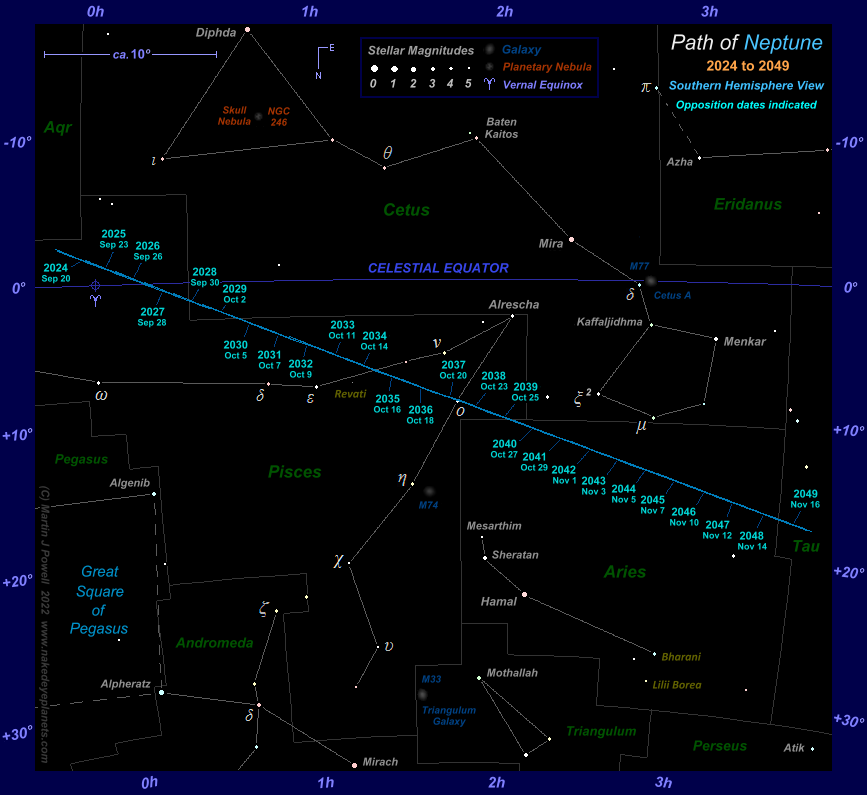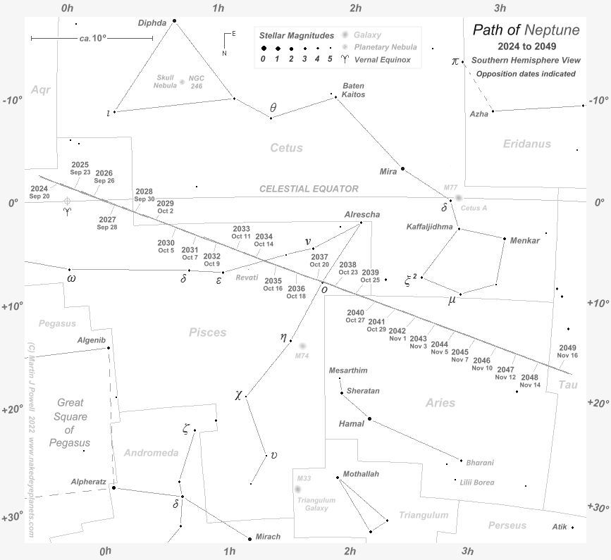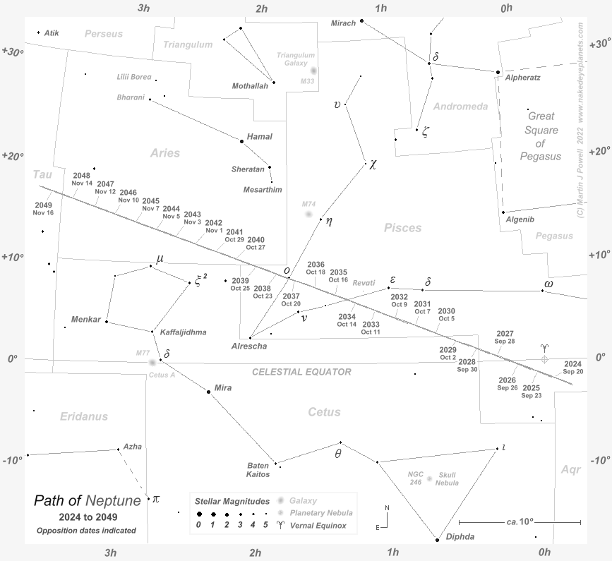 Neptune entered the constellation of Pisces, the Fishes, in early May 2022, where it will be mostly positioned through to May 2039. During this 17-year period Neptune retrogrades back into Aquarius, the Water Carrier, in August 2022 and November 2023 (in the latter case for just ten days). The planet crosses the celestial equator (where the declination of a celestial body is 0°) in Pisces in April 2026 (heading North-eastwards and moving direct), in September 2026 (heading South-westwards and moving retrograde) and again in February 2027 (resuming North-easterly motion, moving direct).