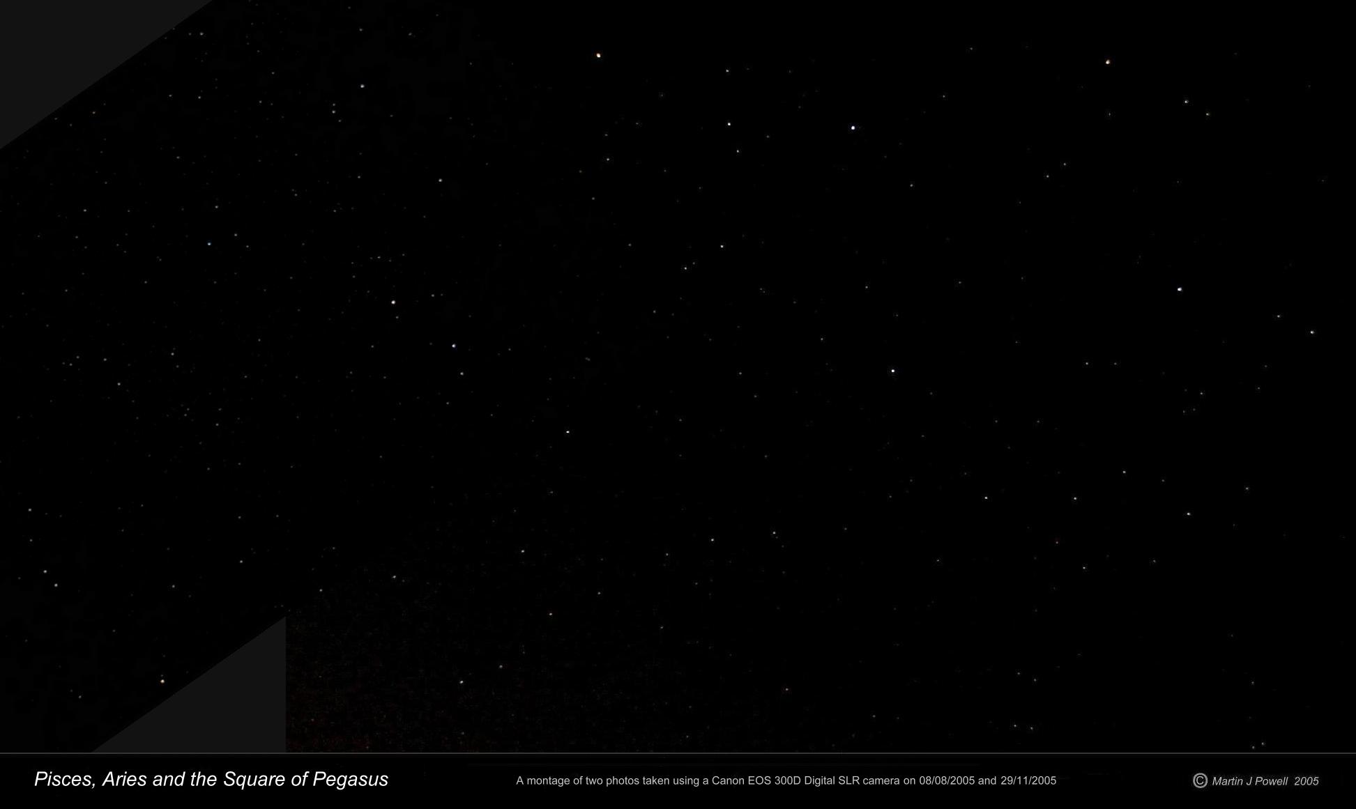 Pisces and Aries A montage of two photographs showing the region of the night sky through which Neptune passes through to 2050. Stars can be seen down to about magnitude +7 (click on the thumbnail for the full-size image and click here to see an annotated version of the photograph) |