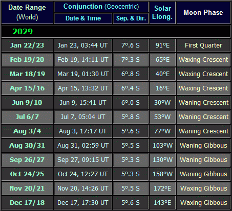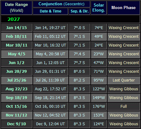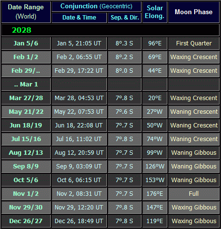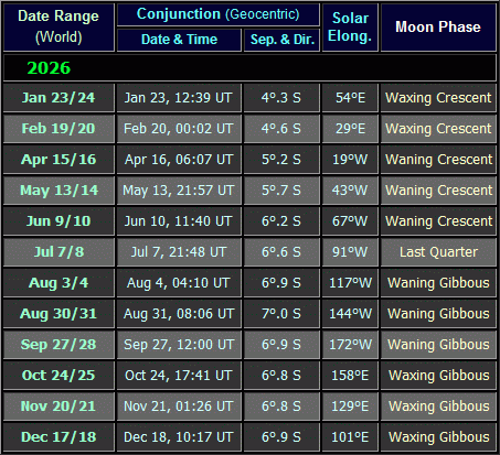 In the 'When Visible' column, a distinction is made between Dawn/Morning visibility and Dusk/Evening visibility; the terms Dawn/Dusk refer specifically to the twilight period before sunrise/after sunset, whilst the terms Evening/Morning refer to the period after darkness falls/before twilight begins (some conjunctions take place in darkness, others do not, depending upon latitude). The 'Con' column shows the constellation in which the planets were positioned at the time of the conjunction.