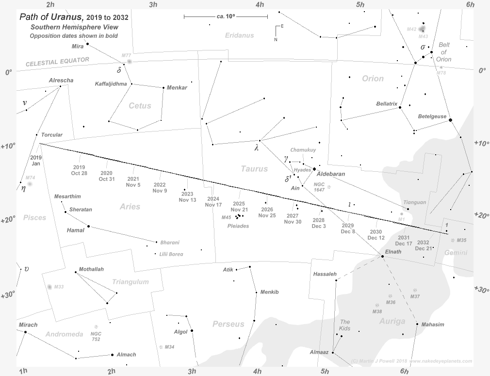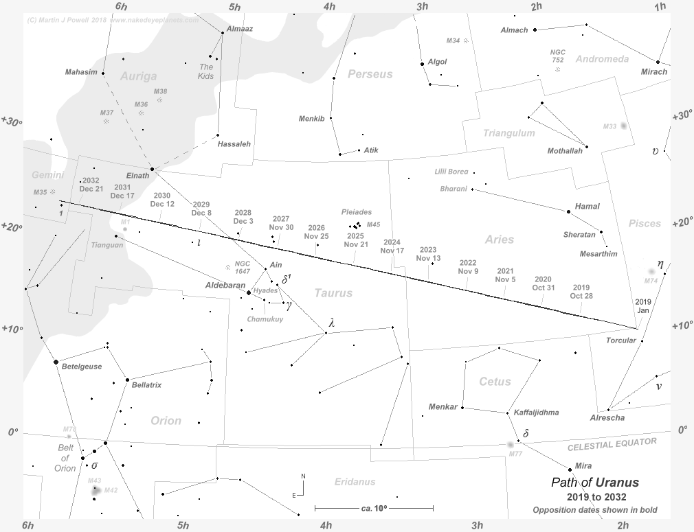 Star map showing the path of Uranus against the background stars of Aries and Taurus from 2019 to 2032, with the position of each opposition date marked (click on the thumbnail for the full-size image). From 2019 through 2022 Uranus describes a series of shallow, Southward-facing loops because the planet is then South of the ecliptic (the individual loops are about 4º wide and are not discernible in this map because of its small scale). From 2023 through 2025 Uranus describes hybrid loops (half loop, half zig-zag) followed by zig-zag formations from 2026 to 2030, the planet crossing to the North of the ecliptic in mid-2029. Uranus then returns to hybrid loops from 2031 through to the end of the period.