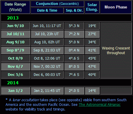 Venus conjunctions with other planets during 2013 (click for full-size table, 14 KB). The column headed 'UT' is the Universal Time (equivalent to GMT) of the conjunction (in hrs : mins). The separation (column 'Sep') is the angular distance between the two planets, measured relative to Venus, e.g. on 2013 May 28, Jupiter was positioned 1°.0 South of Venus at the time shown. The 'Fav. Hem' column shows the Hemisphere in which the conjunction was best observed (Northern, Southern and/or Equatorial). The expression 'Not high N Lats' indicates that observers at latitudes further North than about 45°N would have found the conjunction difficult or impossible to observe because of low altitude and/or bright twilight.