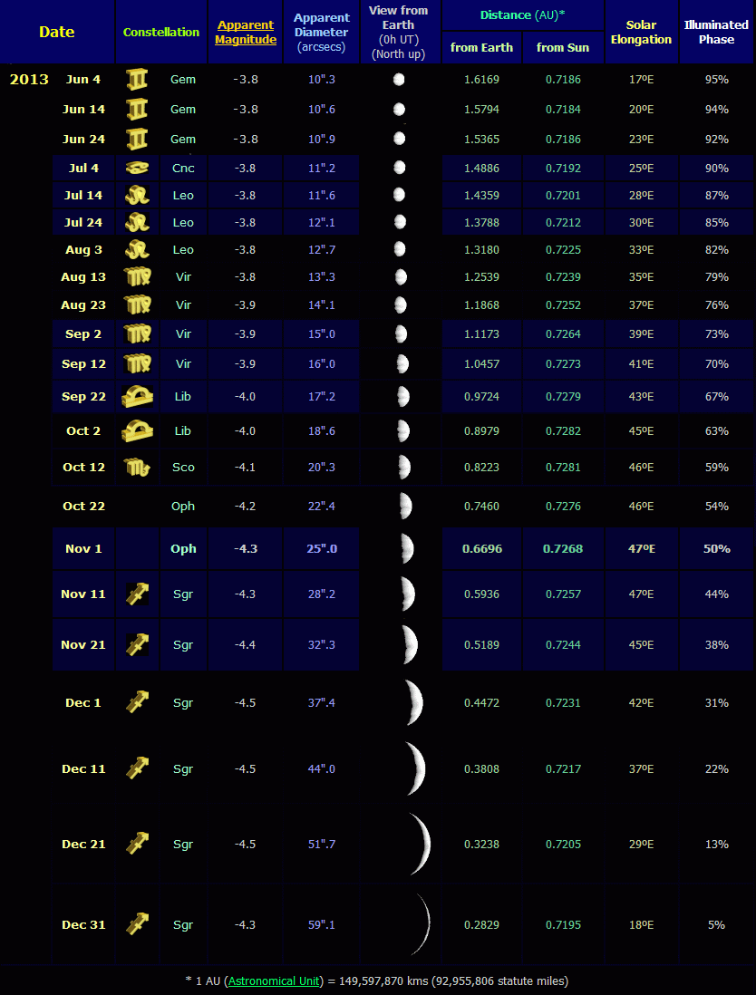 Table of selected data relating to the evening apparition of Venus during 2013 (click for full-size table, 67 KB). The data is listed at 10-day intervals, corresponding with the dates shown in bright white on the star charts 1 and 2. The data for the table was obtained from 'MegaStar', 'Redshift 5' and 'SkyGazer Ephemeris' software and the Venusian disk images were derived from NASA's Solar System Simulator.