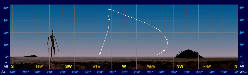 The Path of Venus in the Evening Sky (plotted for 30 mins after sunset) during 2013-14 for an observer at latitude 30° South. Click here (97 KB) for the overlay grid. |