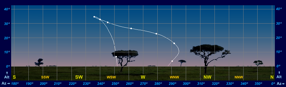 Northern tropical latitudes now saw the planet at its highest altitude after sunset. At latitude 20º North Venus was positioned 28º high in the South-west at 30 minutes after sunset, setting 2½ hours later.