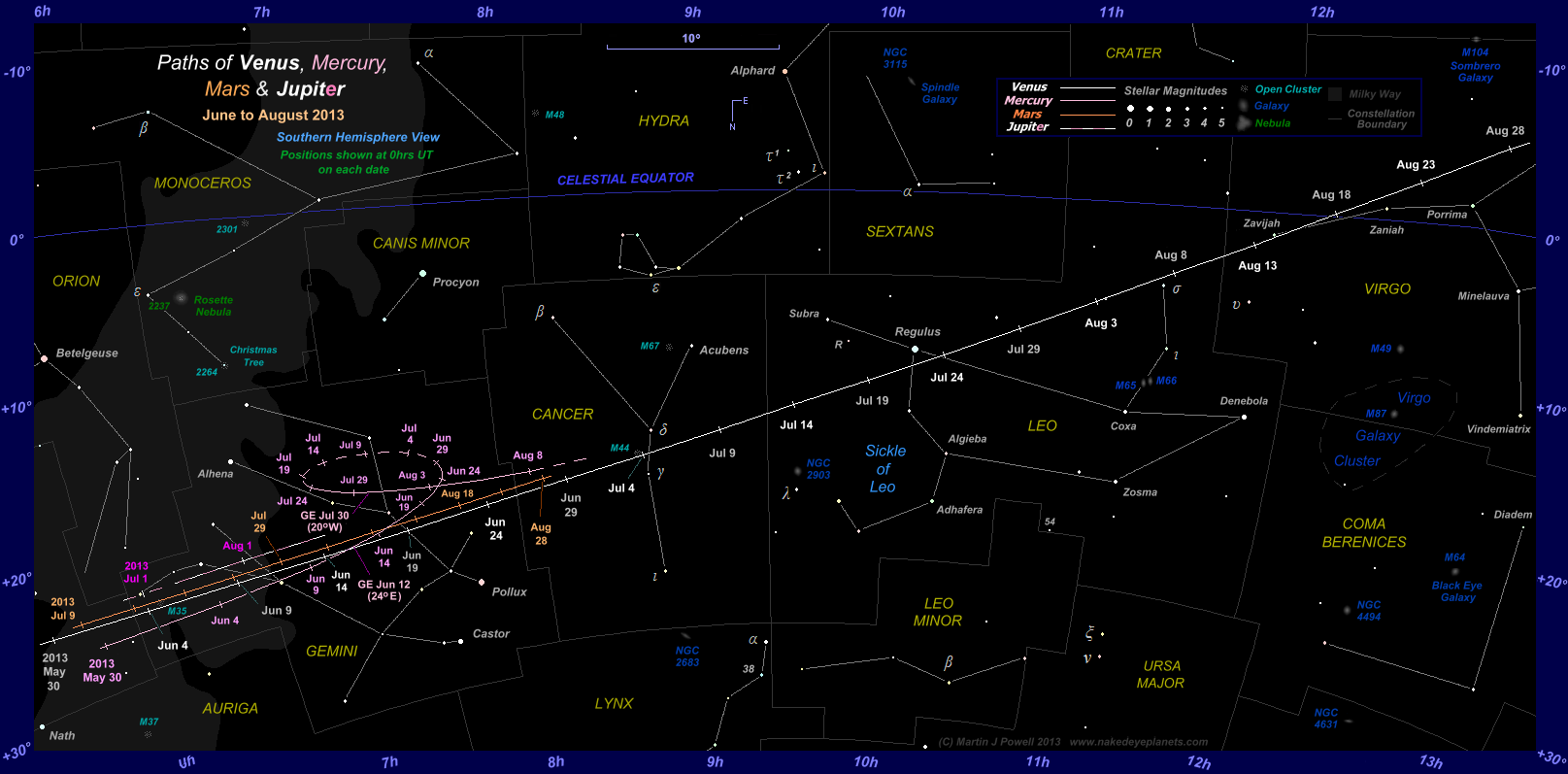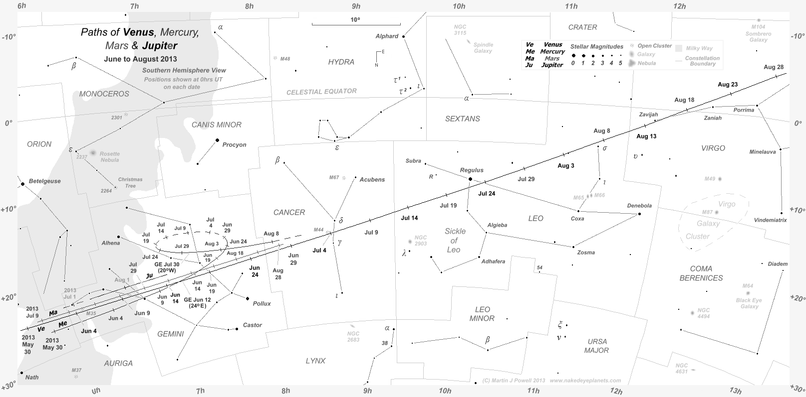 On June 12th Mercury reached its greatest Eastern elongation of 24°, positioned in central Gemini some 4°.3 East of Venus. Mercury passed just under 2° South of Venus on June 20th in the second and last conjunction between these two planets during the evening apparition of 2013. In late June Mercury's apparent motion slowed, stopped and reversed, such that it now moved retrograde (East to West) and headed in towards the Sun. Mercury became increasingly difficult to see after about June 29th and was lost from view by early July.