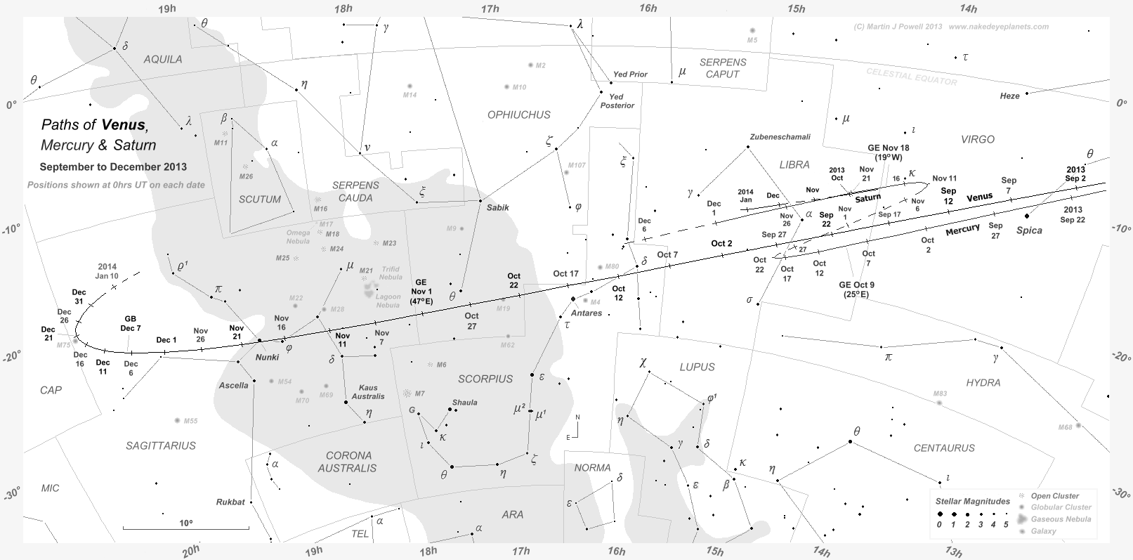 For Venus, apparition data for the dates shown in bright white (at 10-day intervals) are included in the table below. The positions at which Venus and Mercury attained greatest elongation from the Sun are indicated by the letters 'GE', with the solar elongation angle in brackets. Eastern elongations apply for evening apparitions and Western elongations for morning apparitions (the elongation of Venus is Easterly throughout the chart coverage). The position at which Venus attained greatest brilliancy for this apparition (apparent magnitude = -4.6) is shown by the letters 'GB'. Note that the September-October 2013 evening apparition of Mercury shown on the chart favoured Southern hemisphere observers (who should refer to the Southern hemisphere chart (203 KB) for a more appropriate orientation) whilst the November morning apparition favoured Northern hemisphere observers.
