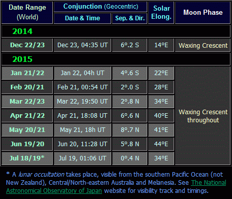 Although the dates indicated in the above diagrams refer specifically to the period 2014-15, Venus has an 8-year cycle of apparitions such that its position in the evening sky in 2014-15 will repeat very closely in the evening sky of 2022-23. The writer refers to this particular evening apparition as Apparition F1; for more details, see the accompanying article describing The Venus 8-year Cycle.