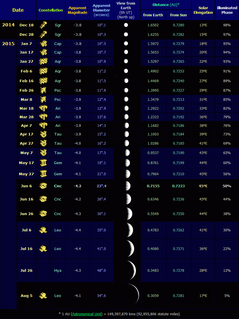 Jupiter, magnitude -1.6, was now in the closing stage of its 2014-15 apparition, having spent about half of this period in Cancer and the other half in Leo. The planet was moving direct (prograde) when Venus caught up with it on July 1st and passed just 0°.4 to the South of the giant planet in a spectacular and close planetary conjunction - the best of its 2014-15 evening apparition. The conjunction was best seen from the Southern hemisphere, however much of the Northern hemisphere also got a good view. Again, further details can be found in the planetary conjunctions section below.