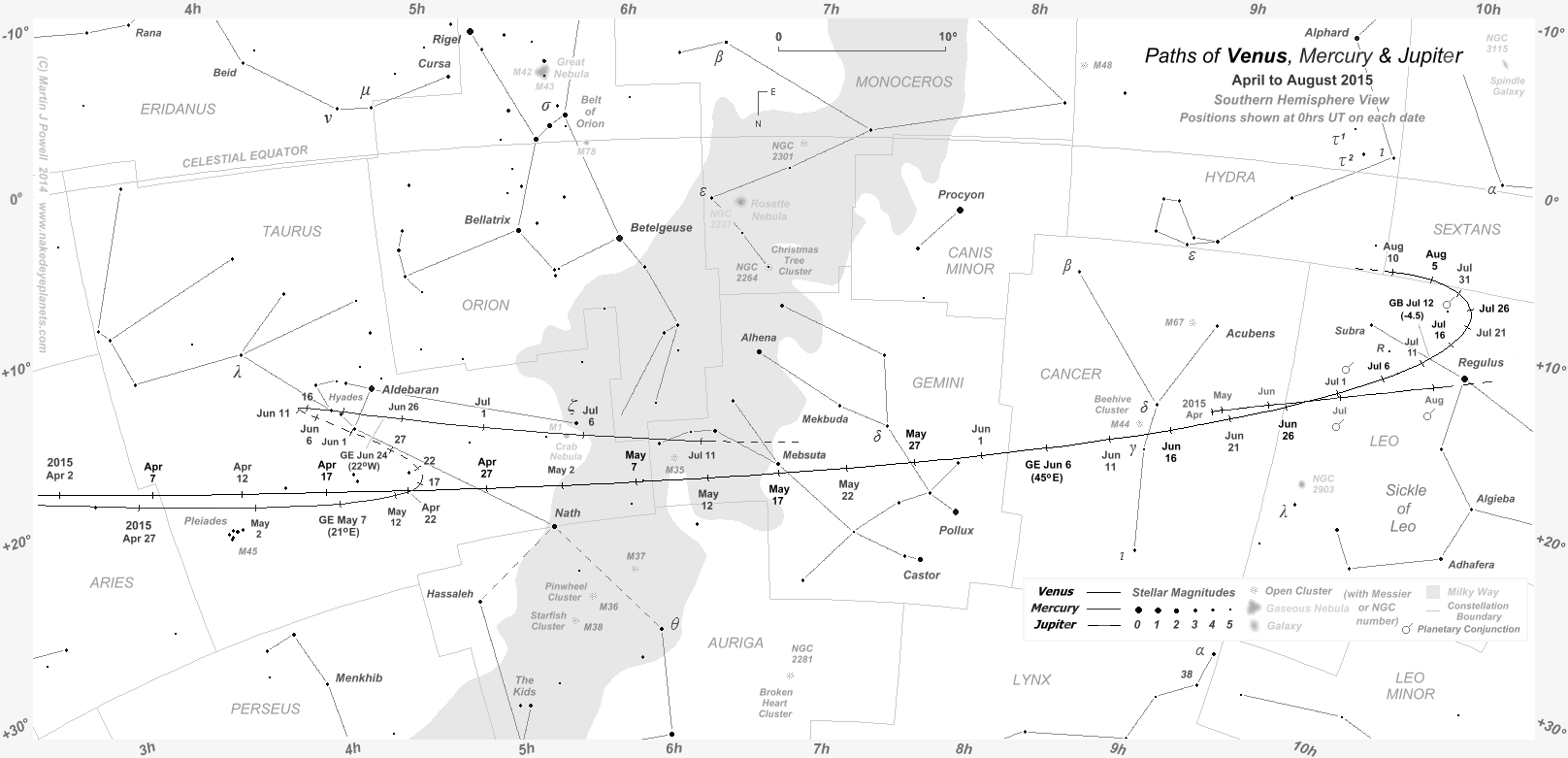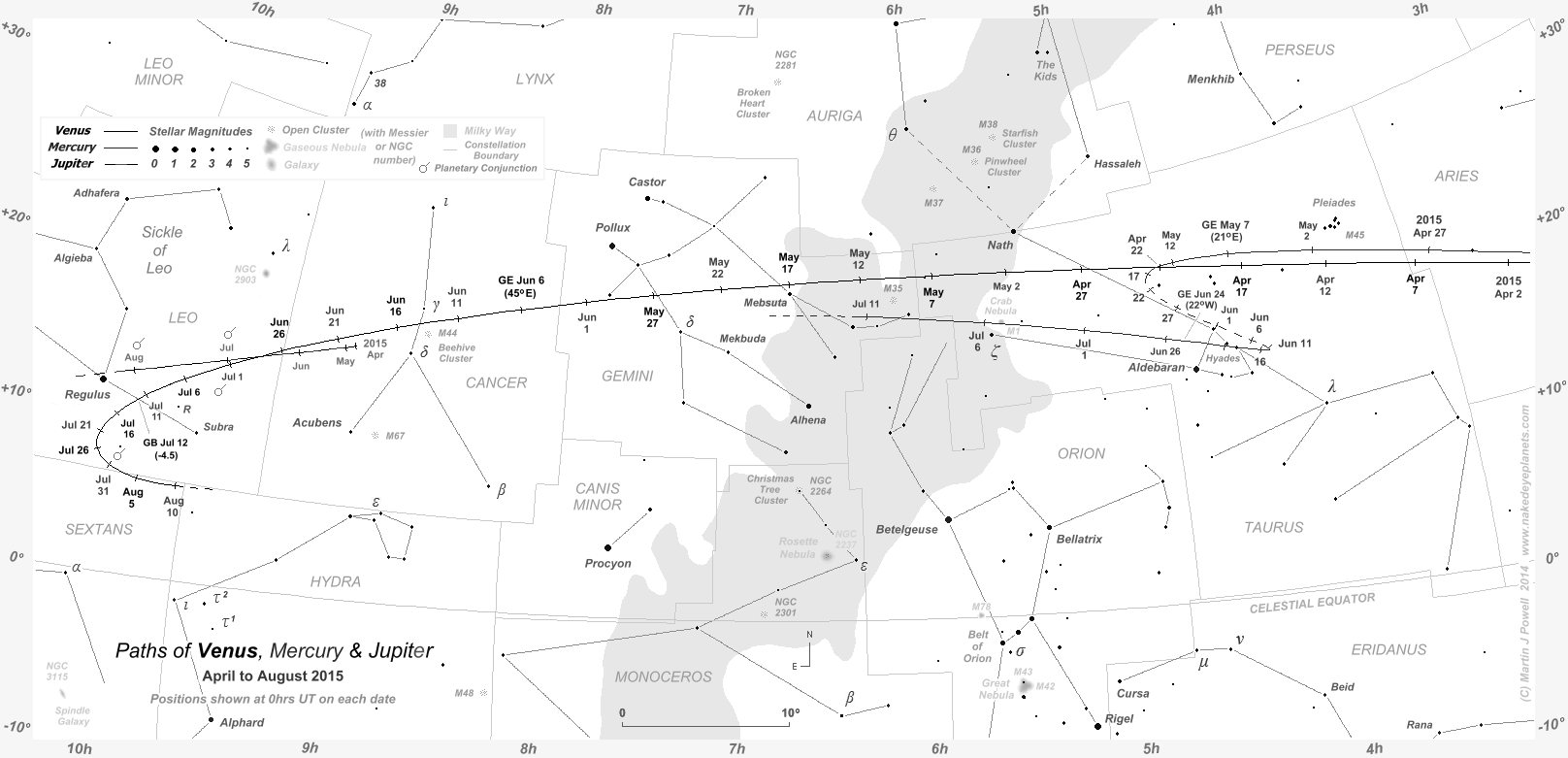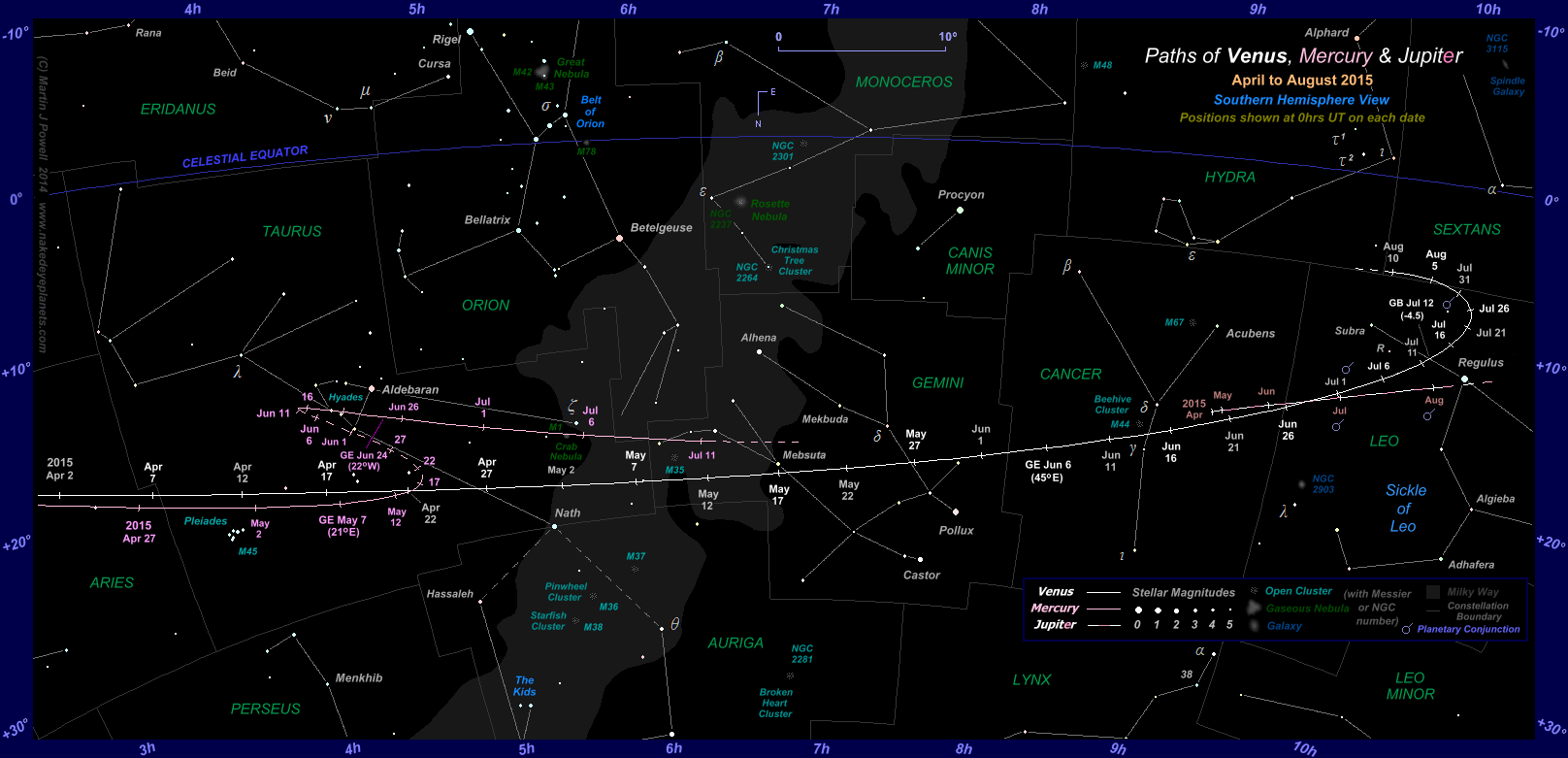 The positions at which Mercury and Venus attained greatest elongation from the Sun are indicated by the letters 'GE', with the solar elongation angle in brackets; it is Eastern (E) in the evening and Western (W) in the morning (the elongation of Venus is Easterly throughout the chart coverage). The April-May 2015 evening apparition of Mercury favoured Northern hemisphere observers whilst the morning apparition of June-July favoured Southern hemisphere observers (who should refer to the Southern hemisphere chart (198 KB) for a more appropriate orientation).