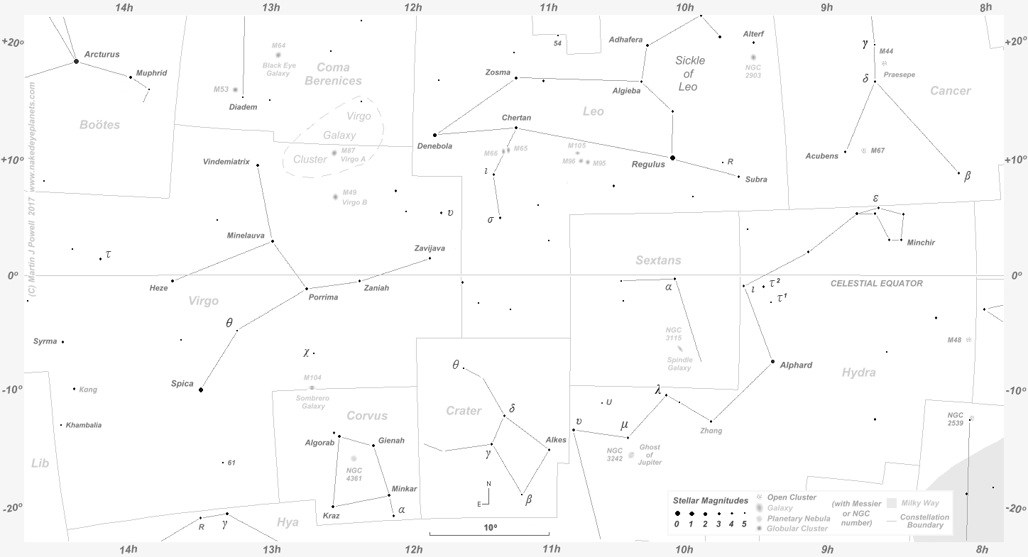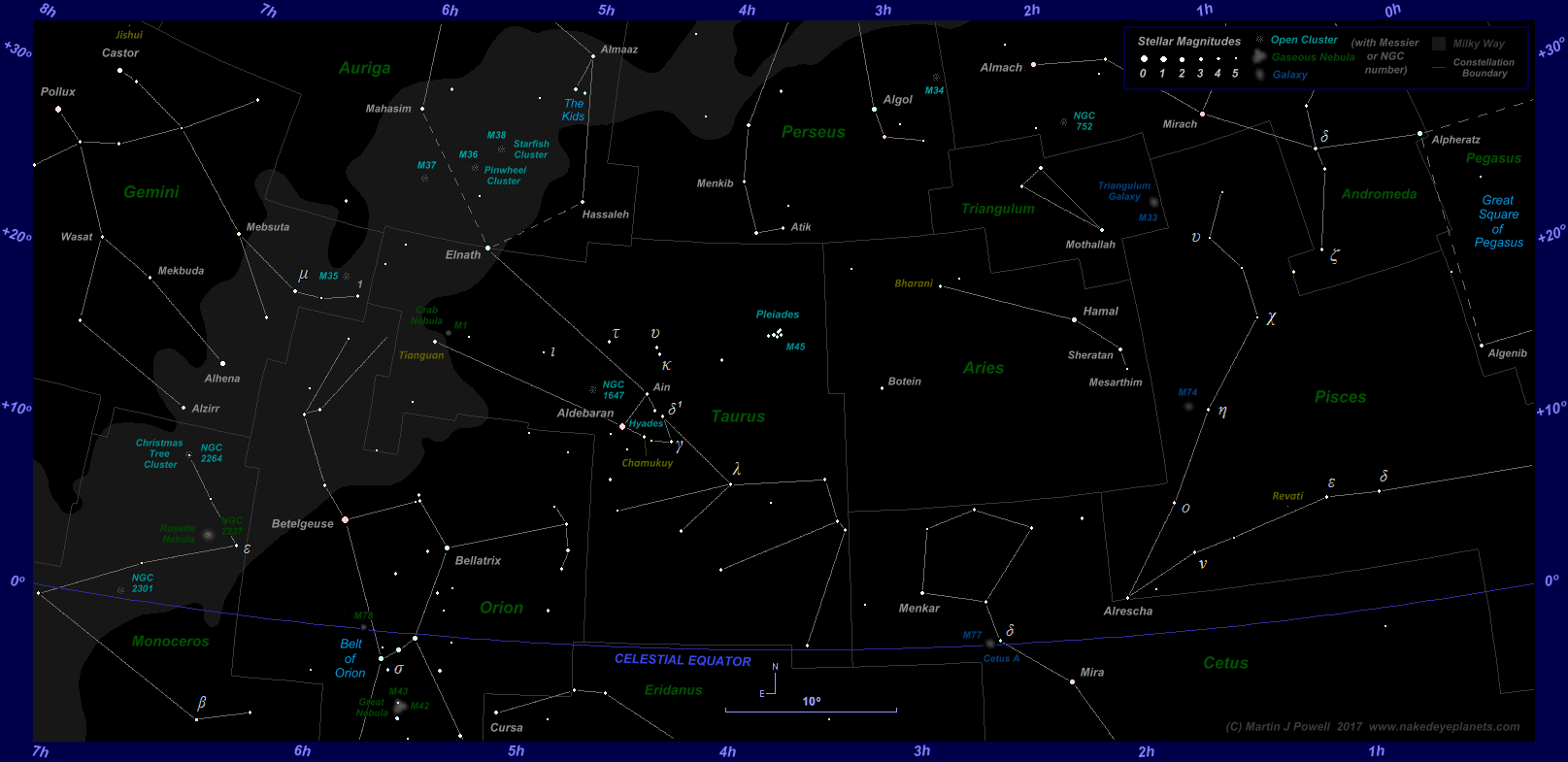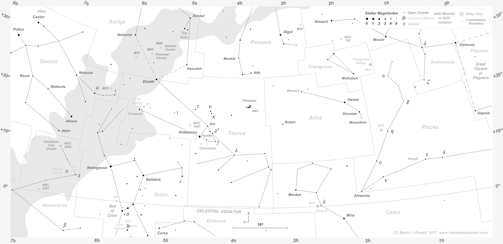 The faintest stars shown on the chart have an apparent magnitude of about +4.8. Printer-friendly versions of this chart are available for Northern (80 KB) and Southern hemisphere (81 KB) views. Astronomical co-ordinates of Right Ascension (longitude, measured Eastwards in hrs:mins) and Declination (latitude, measured in degrees North or South of the celestial equator) are marked around the border of the chart.