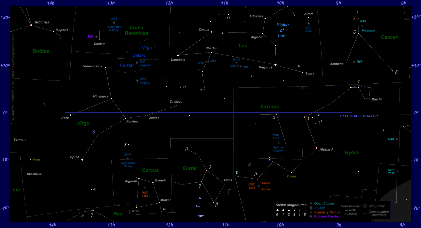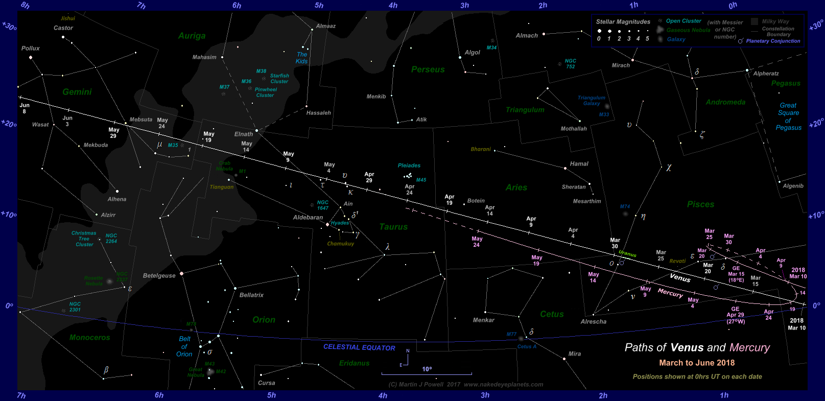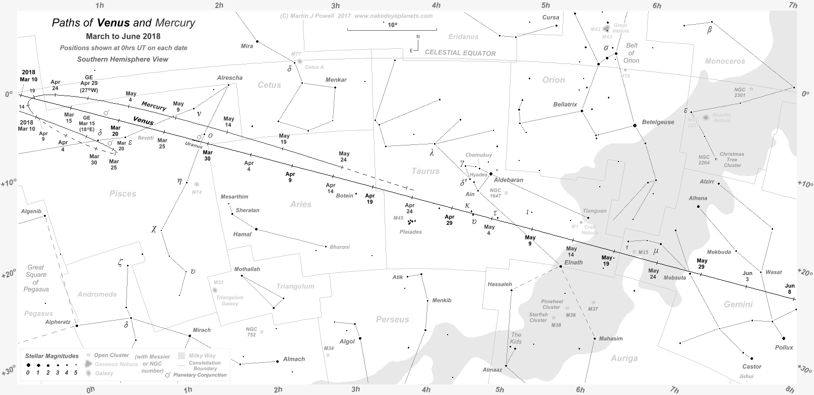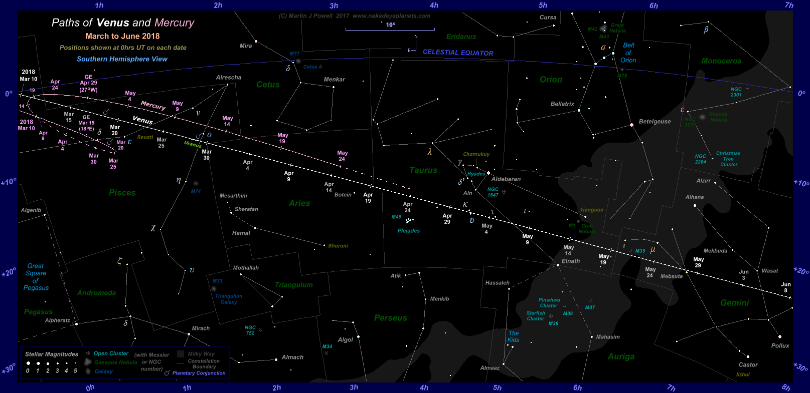 On March 12th Venus made a brief exit from the zodiac, entering the constellation of Cetus, the Whale at 14 hours UT, cutting diagonally across its North-western corner. The planet reached 15° East of the Sun on the same day.