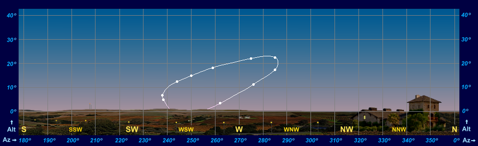 The Path of Venus in the Evening Sky (plotted for 30 mins after sunset) during 2018 for an observer at latitude 55° North. Click here (123 KB) for the overlay grid. |