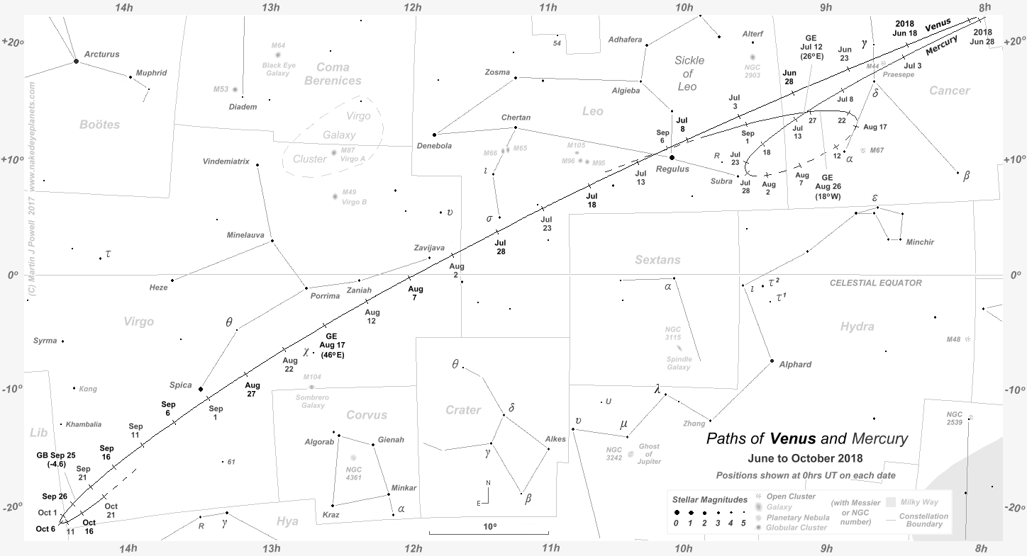 The positions at which Mercury and Venus attained greatest elongation from the Sun are indicated by the letters 'GE', with the solar elongation angle in brackets. The June/July evening apparition of Mercury favoured Southern hemisphere observers (who should refer to the Southern hemisphere chart (180 KB) for a more appropriate orientation) whilst the morning apparition of August/Sepember favoured Northern hemisphere observers. The position at which Venus attained greatest brilliancy for this apparition (apparent magnitude = -4.6) is shown by the letters 'GB'.