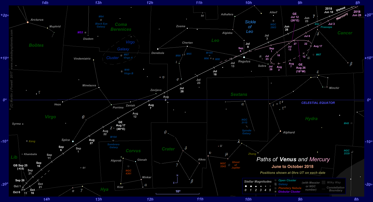 The paths of Venus and Mercury through the zodiac constellations during the latter part of Venus' evening apparition in 2018 (click on the thumbnail for the full-size image, 176 KB). The earlier part of the apparition appears in the star chart below. Positions are plotted for 0 hrs Universal Time (UT) at 5-day intervals. For Venus, apparition data for the dates shown in bright white (at 10-day intervals) are included in the table below.