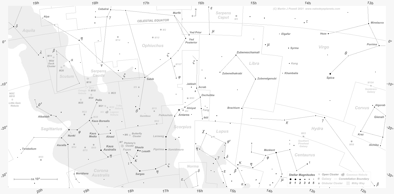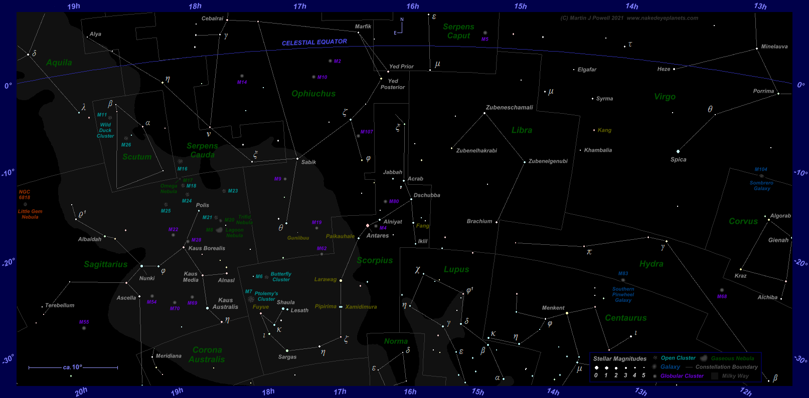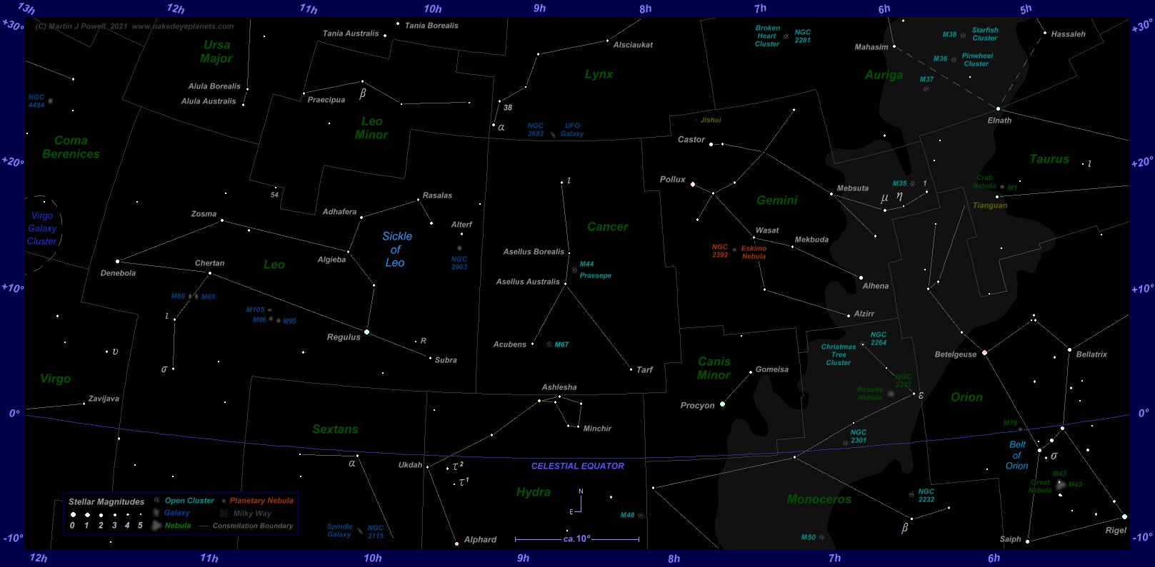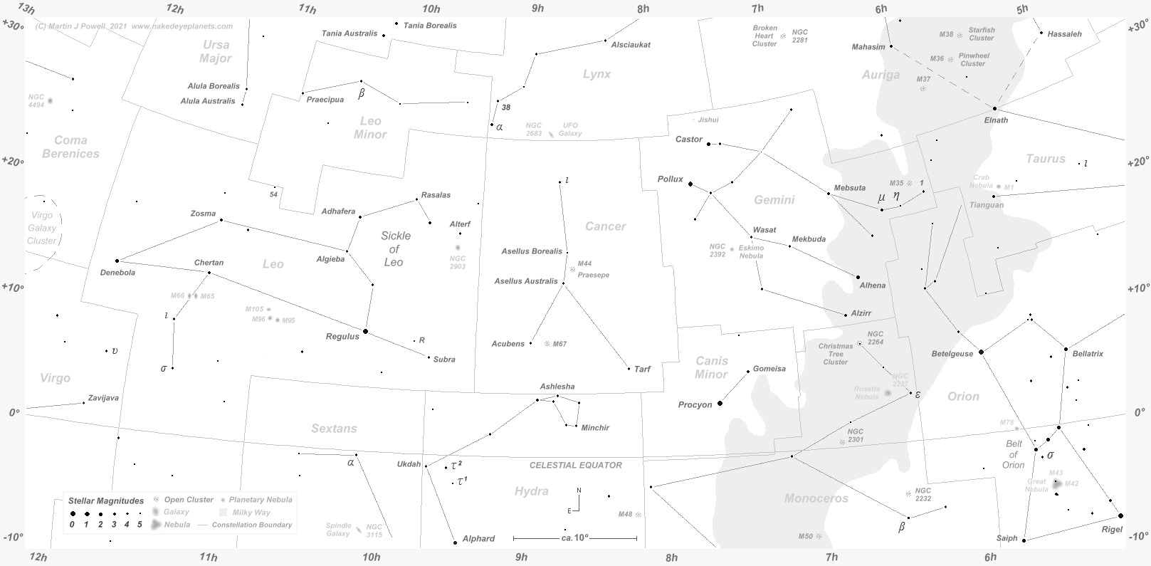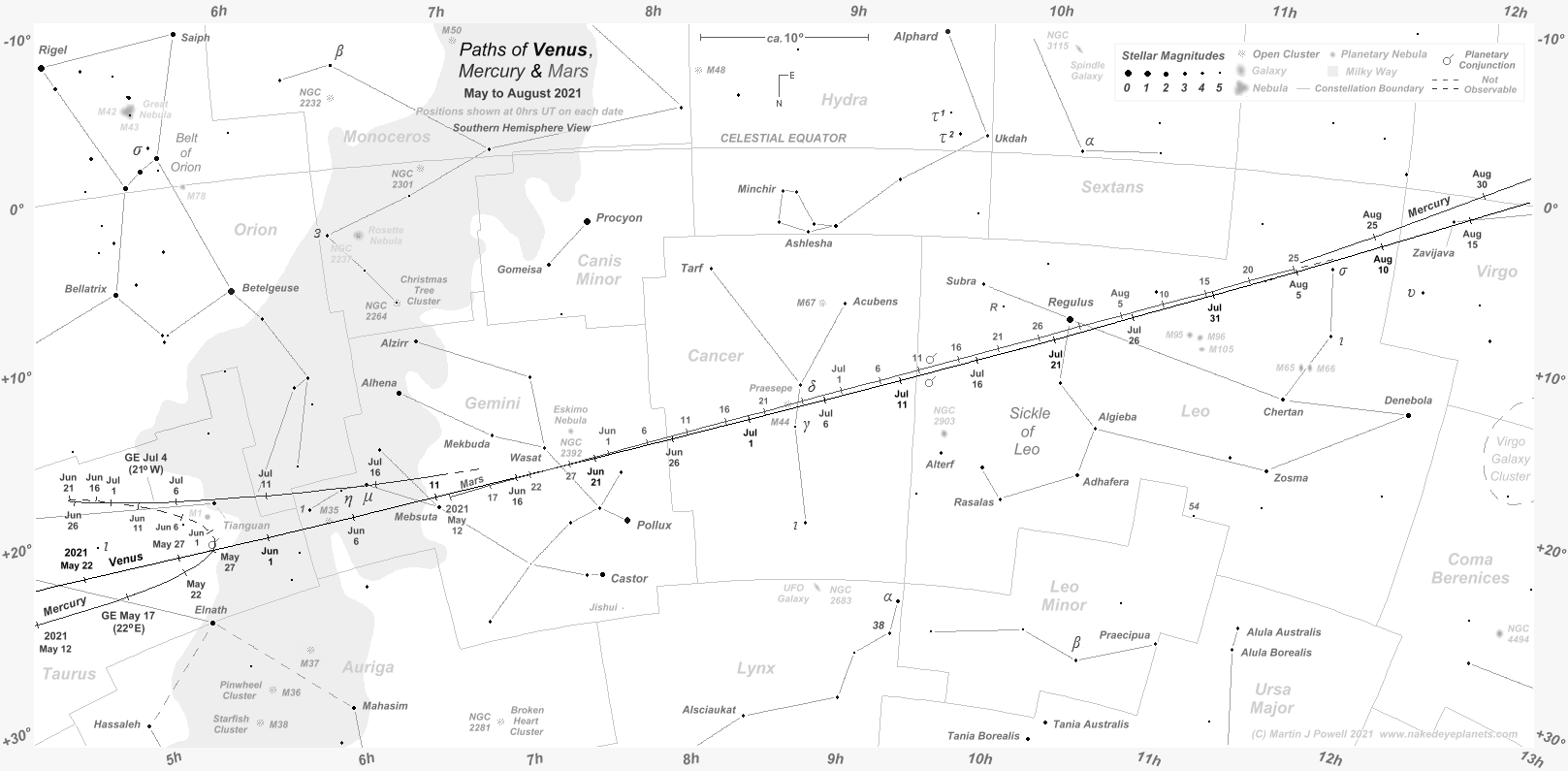 The faintest stars shown have an apparent magnitude of about +4.8. Printer-friendly versions of this chart are available for Northern (103 KB) and Southern hemisphere (104 KB) views. Click here (179 KB) to see a 'clean' star map of the area (i.e. without planet paths); a printer-friendly version can be seen here (85 KB). Astronomical co-ordinates of Right Ascension (longitude, measured Eastwards in hrs:mins) and Declination (latitude, measured in degrees North or South of the celestial equator) are marked around the border of the chart.