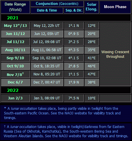 Venus conjunctions with other planets during the 2021-22 evening apparition (click on the thumbnail for the full-size table, 24 KB). The column headed 'UT' is the Universal Time (equivalent to GMT) of the conjunction (in hrs : mins). The separation (column 'Sep') is the angular distance between the two planets, measured relative to Venus, e.g. on 2021 Jul 13, Mars was positioned 0°.5 South of Venus at the time shown. The 'Fav. Hem' column shows the Hemisphere in which the conjunction was best observed (Northern, Southern and/or Equatorial). Note that observers located close to the Northern/Southern visibility boundary of any given conjunction will have found it difficult or impossible to observe because of low altitude and/or bright twilight.