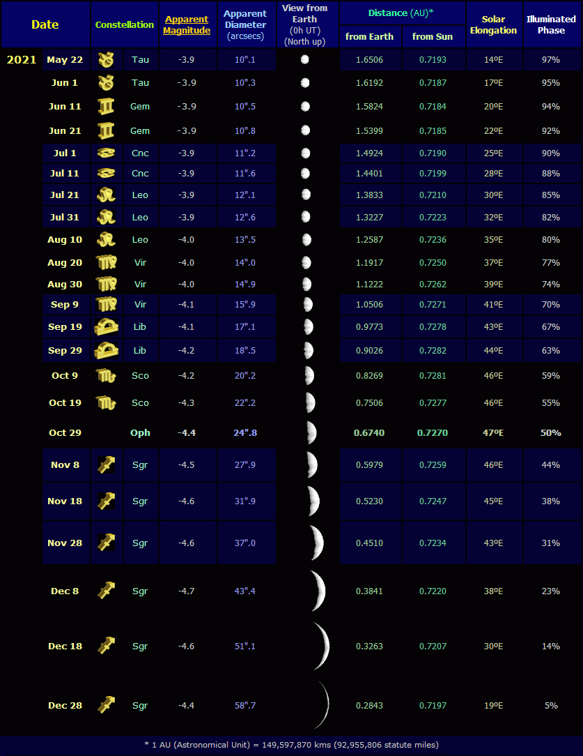 Table of selected data relating to the evening apparition of Venus during 2021 (click on the thumbnail for the full-size table, 66 KB). The data is listed at 10-day intervals, corresponding with the dates shown in bright white on the star charts 1 and 2. The data for the table was obtained from the software 'Redshift 5' , 'MegaStar' and 'SkyGazer Ephemeris'. The Venusian disk images were derived from NASA's Solar System Simulator.