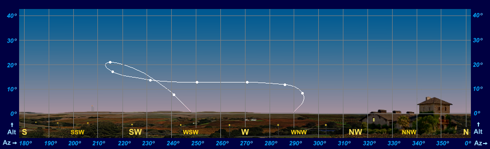 The Path of Venus in the Evening Sky (plotted for 30 mins after sunset) during 2021-22 for an observer at latitude 55° North. Click here (124 KB) for the overlay grid. |