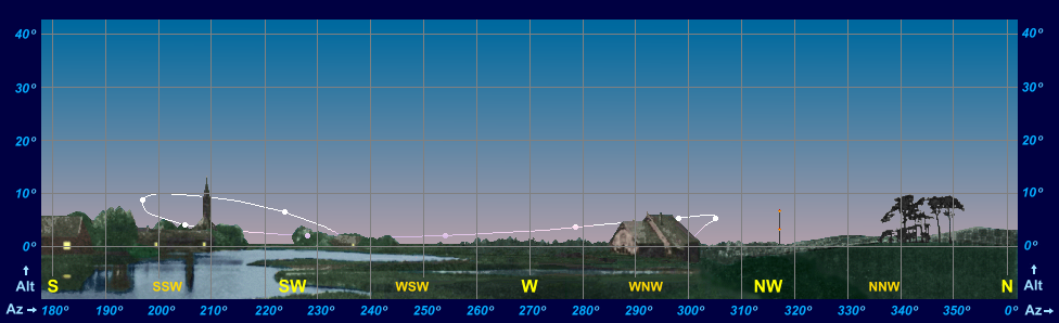 In early December observers at mid-Northern latitudes now saw Venus at its best, although the altitudes were somewhat disappointing. Half an hour after sunset at latitude 40º North, the planet was positioned 18º high in the South-west, whilst at 50º North the planet was positioned only 13º high in the SSW. Over the next two weeks, observers at latitude 60º North saw the planet setting in near-darkness for the first time in the apparition.