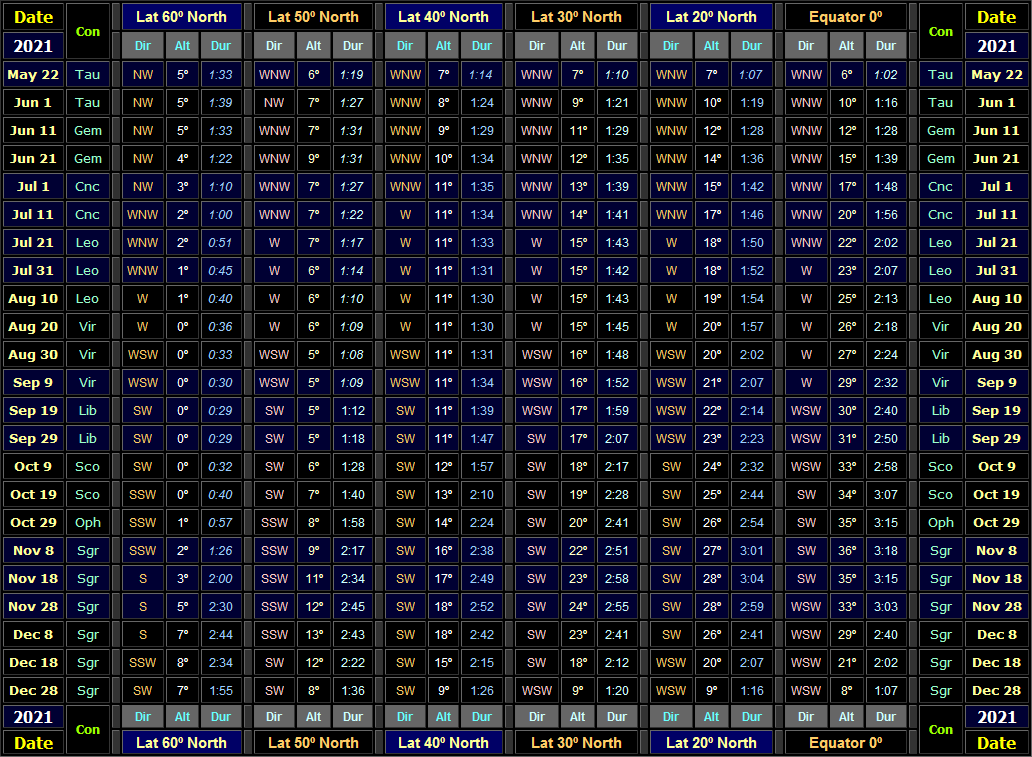 Note that the directions and altitudes refer to the planet's position at 30 minutes after local sunset. To find the time of local sunset at your own location, select your country/town from the drop-down menu at the TimeandDate.com website. The approximate time at which Venus set can be found by adding the visibility duration on a particular date (column Dur) to the time of local sunset on the same date. To find the direction in which Venus set on any given date for a particular latitude, note down the constellation in which the planet was located on the required date (column headed Con) then find its setting direction for your latitude in the Rise-Set direction table.