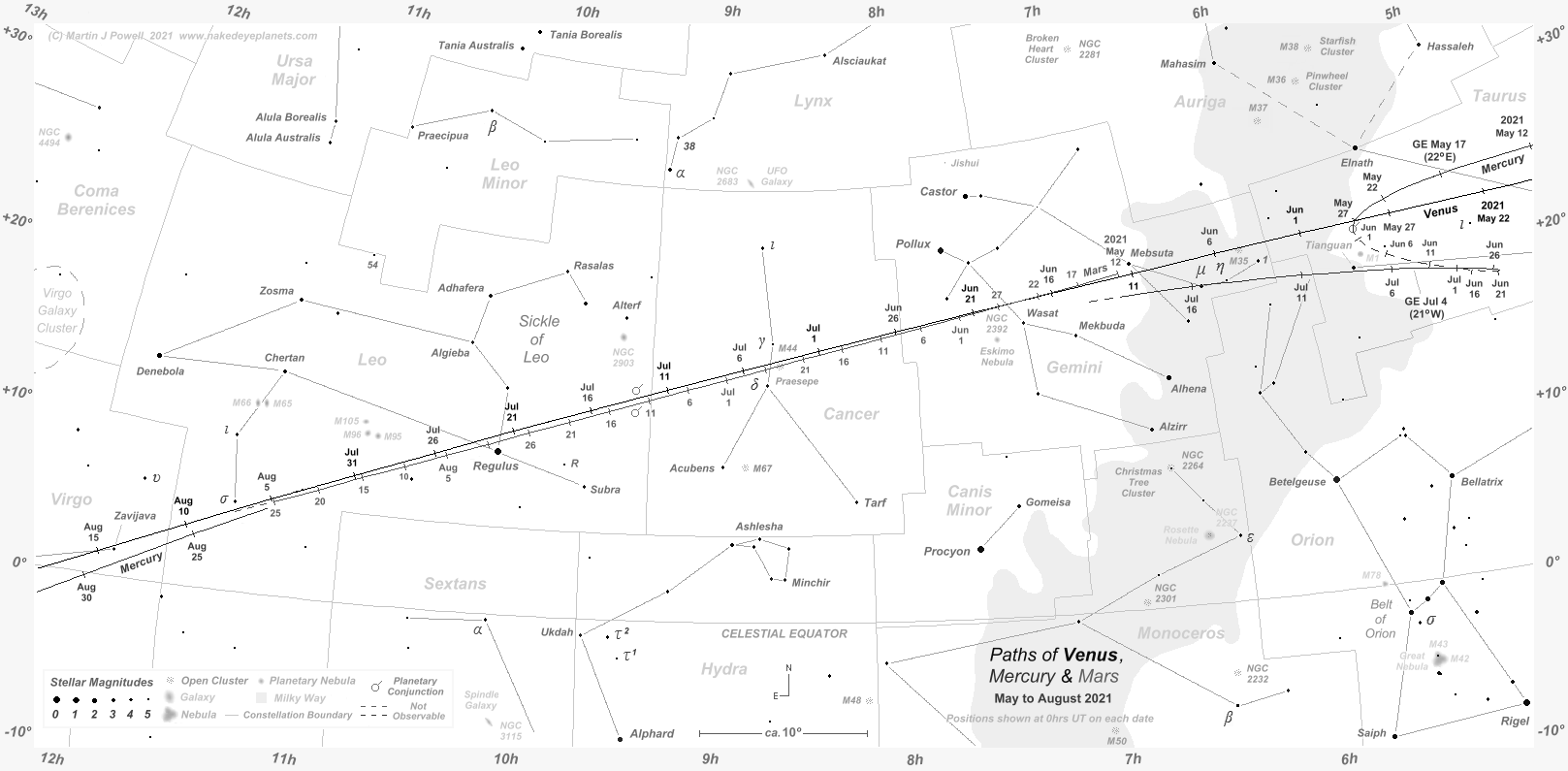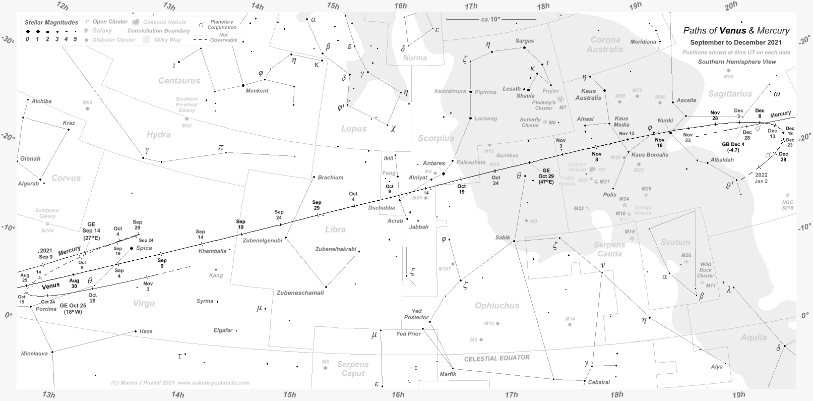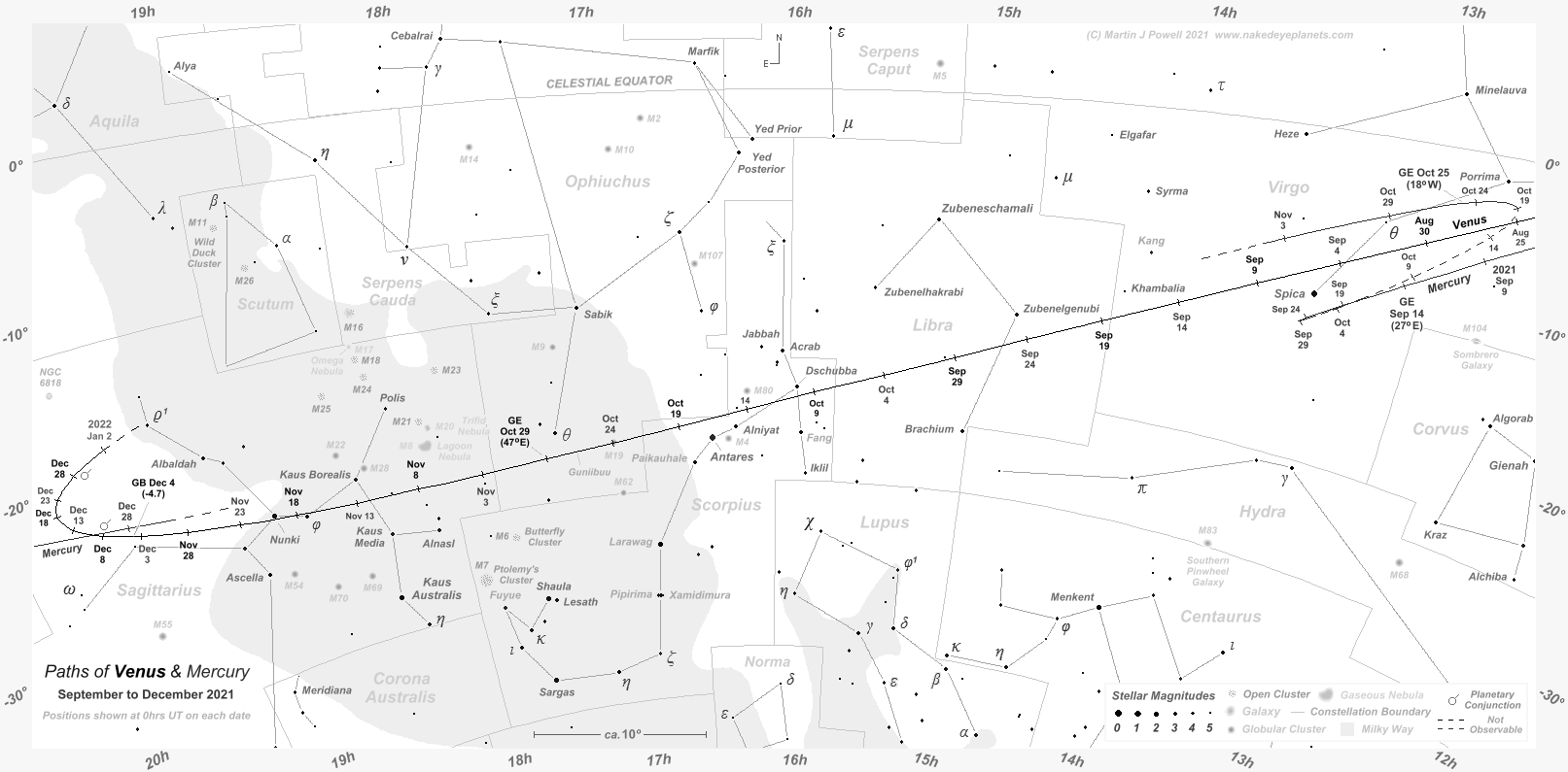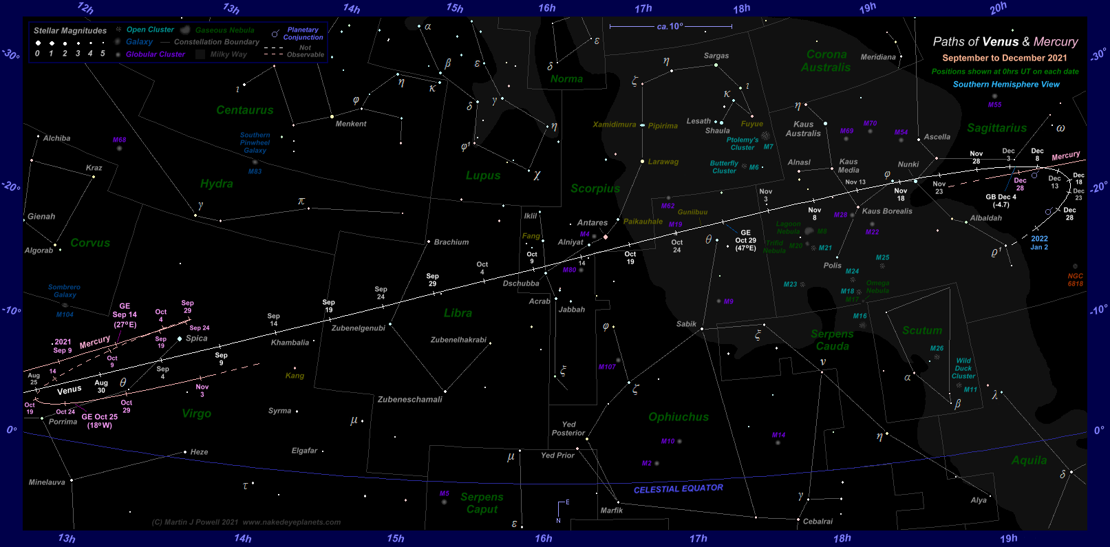 The positions at which Venus and Mercury attained greatest elongation from the Sun are indicated by the letters 'GE', with the solar elongation angle in brackets; Eastern elongations apply for evening apparitions and Western elongations for morning apparitions. Note that the September 2021 evening apparition of Mercury shown on the chart favoured Southern hemisphere observers whilst the October morning apparition favoured Northern hemisphere observers.