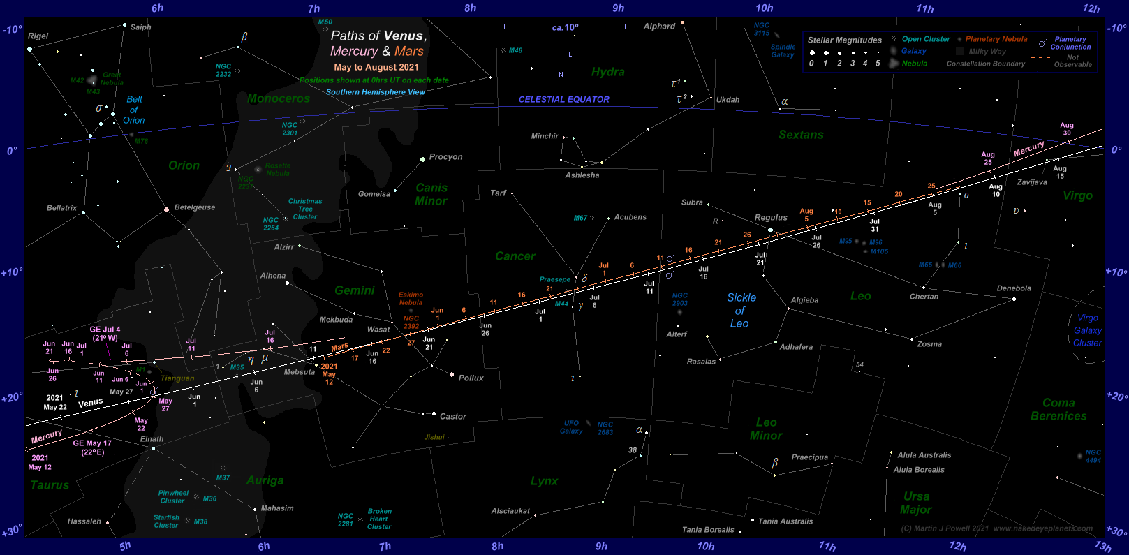 Venus entered Chart 1 coverage on May 20th, with Mercury positioned 7°.7 to its ENE, having faded to magnitude +0.9. Venus reached 15° East of the Sun on May 23rd, by which time observers at Southern Tropical and mid-Southern latitudes had begun to detect the planet, low down in the WNW at dusk.