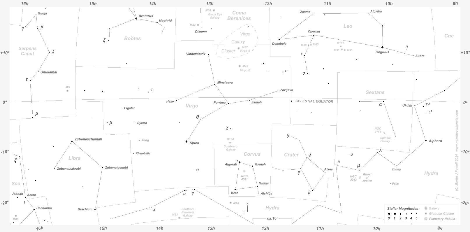 At 10:51 UT on March 9th, Mercury passed 6°.3 to the South of a slowly retrograding Venus in the final planetary conjunction of Venus' 2024-25 evening apparition. This wide conjunction was not observable South of about latitude 19° South (for more details see the planetary conjunctions section below). Having raced past Venus, Mercury's apparent motion rapidly slowed in the week following conjunction, the planet being 5°.7 SSE of Venus at midnight UT on March 11th, 5°.5 SSE of it at midnight UT on the 12th, 5°.3 South-east of it on the 13th and 5°.6 South-east of it on the 14th. Mercury's apparent motion ceased on March 15th when it reached its Eastern stationary point, 5°.7 South-east of Venus, following which the planet retrograded and was quickly lost from view in the dusk solar glare.