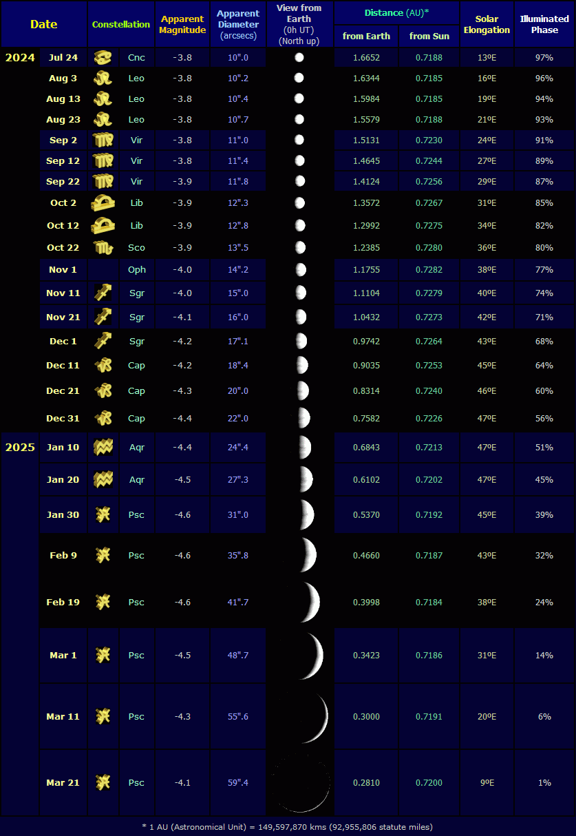 On July 10th Venus passed through its closest orbital point to the Sun, known as the perihelion, at a solar distance of 0.7184 AU (Astronomical Unit), equivalent to 107.5 million kms or 66.8 million statute miles. It was one of two occasions during this apparition when it did so, the next being in February 2025. In the meantime the planet's most distant point from the Sun would be reached one half-orbit later, in October 2024.