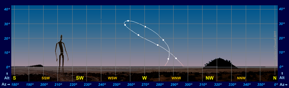 Around February 20th, observers at low-Southern latitudes saw Venus return to the same relative spot above the local horizon that it had been positioned back in mid-August of 2024 (11º high in the WNW at 30 minutes after sunset), the planet having appeared to loop around the Western cardinal point over the course of the last seven months (see horizon diagram for 30° South below).