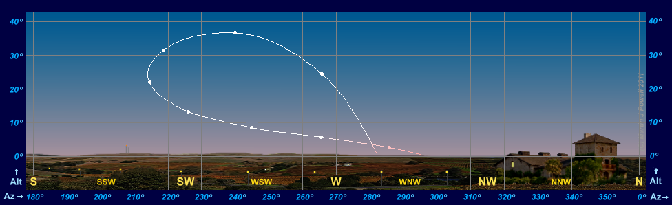 The Path of Venus in the Evening Sky (plotted for 30 mins after sunset) during 2024-25 for an observer at latitude 55° North. Click here for the overlay grid. |