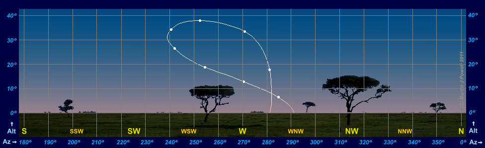 During the second week of March observers at Southern Tropical and Equatorial latitudes lost sight of Venus from the Western dusk sky. Only Northern hemisphere observers could now see the planet in the bright twilight, poised less than 15° above the WNW horizon at thirty minutes after sunset.