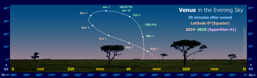 The Path of Venus in the Evening Sky (plotted for 30 mins after sunset) during 2024-25 for an observer at the Equator (latitude 0°). Click here for the overlay grid. |