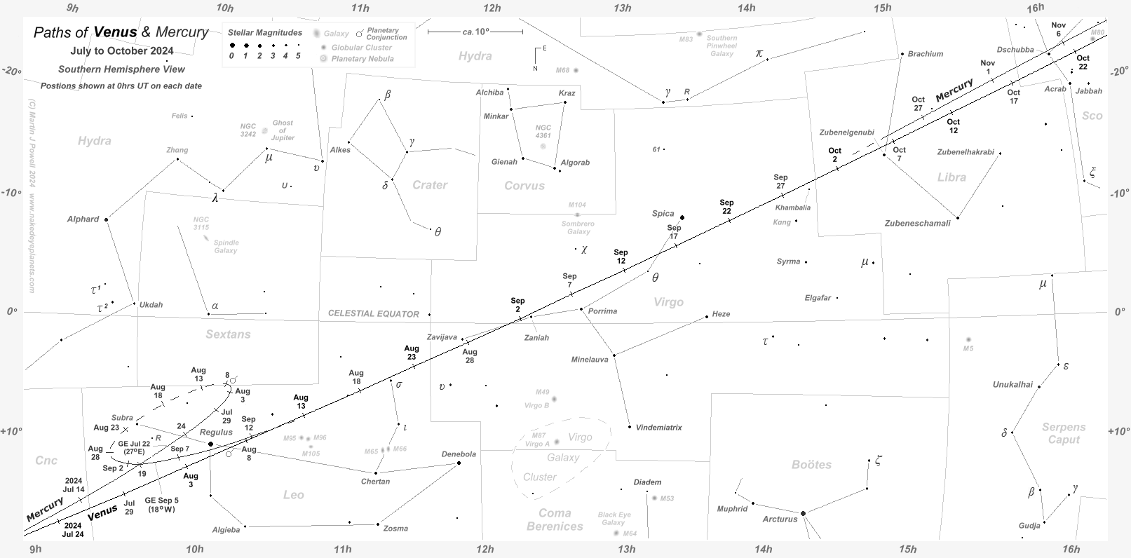 For Venus, apparition data for the dates shown in bright white (at 10-day intervals) are included in the table below. The positions at which Mercury attained greatest elongation from the Sun are indicated by the letters 'GE', with the solar elongation angle in brackets. Eastern elongations apply for evening apparitions and Western elongations for morning apparitions (the elongation of Venus is Easterly throughout the chart coverage). Note that the late June to early August evening apparition of Mercury shown on the chart favoured Southern hemisphere observers (who should refer to the Southern hemisphere chart for a more appropriate orientation) whilst the late August to mid-September morning apparition favoured Northern hemisphere observers. The late October to late November evening apparition - the early part of which appears on the star map - favoured Southern hemisphere observers.