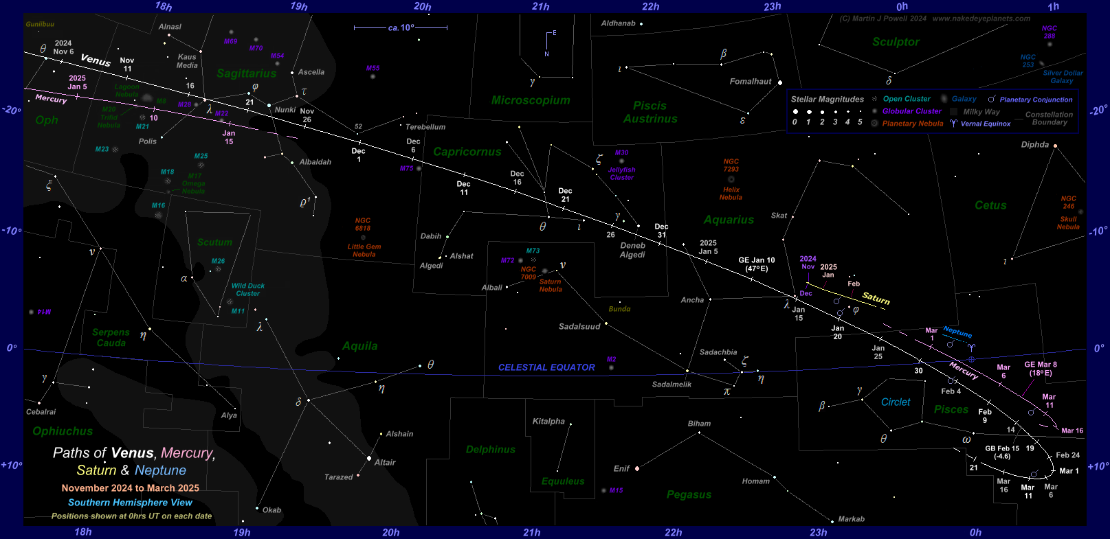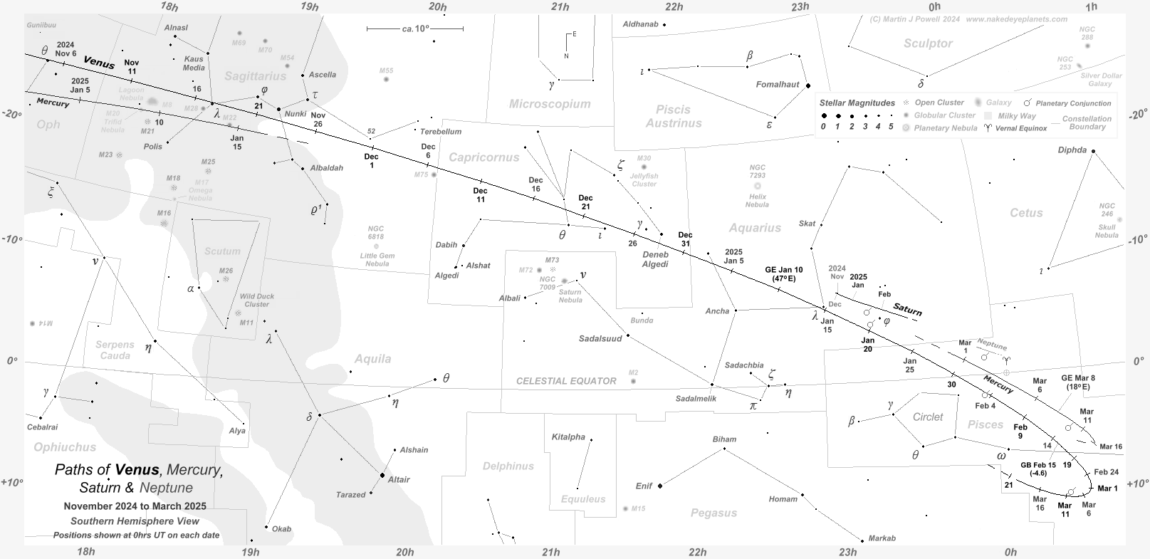 The paths of Venus, Mercury and Saturn through the zodiac constellations during the earlier part of Venus' evening apparition in 2024-25 (click on the thumbnail for the full-size image). The latter part of the planets' apparition is shown in the chart below. Positions are plotted for 0 hrs Universal Time (UT) at 5-day intervals.