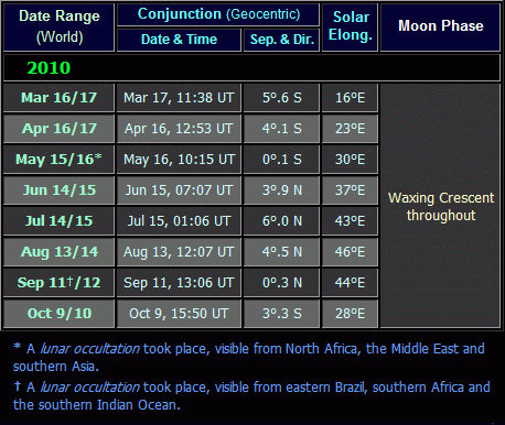 The Moon is easy to find, and on one or two days in each month, it passes Venus in the sky. Use the following tables to see on which dates the Moon passed near the planet between March and October 2010: