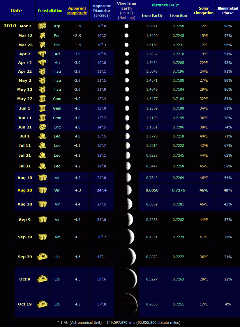 Table of selected data relating to evening apparition of Venus during 2010 (click for full-size table, 75 KB). The data is listed at 10-day intervals, the latter part corresponding with the dates shown in bright white on the star map (top of page). The data for the table was obtained from 'MegaStar', 'Redshift 5' and 'SkyGazer Ephemeris' software and the Venusian disk images were derived from NASA's Solar System Simulator.