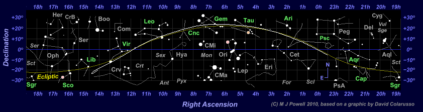 The path of Venus through the zodiac constellations during the planet's evening apparition in 2010 (click on the thumbnail for the full-size image, 55 KB). A version of the diagram with constellation labels (in three-letter format) can be seen here (55 KB) - the full constellation names are listed here. Zodiac constellations are labelled in green and non-zodiac constellations in grey. Also marked on the chart are the ecliptic (the apparent path of the Sun through the constellations, which the Moon and planets follow very closely) and the celestial equator. The numbers along the sides of the chart (Right Ascension and Declination) are co-ordinates of celestial longitude and latitude which astronomers use to locate the position of a celestial body in the night sky.