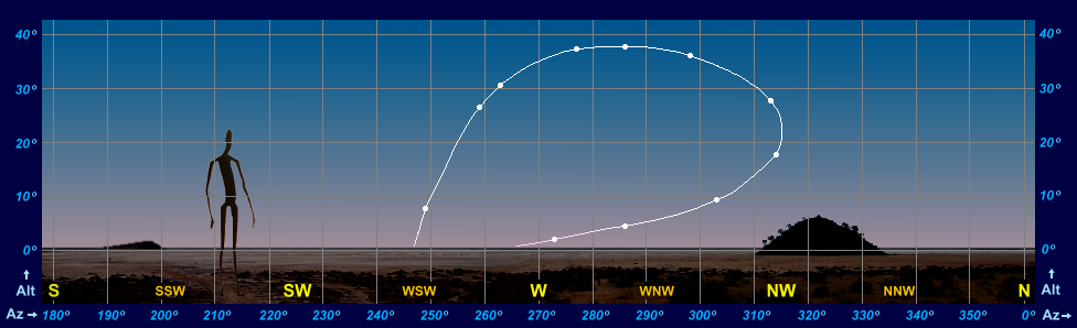 The Path of Venus in the Evening Sky (plotted for 30 mins after sunset) during 2010 for an observer at latitude 55° North. Click here (123 KB) for the overlay grid. |